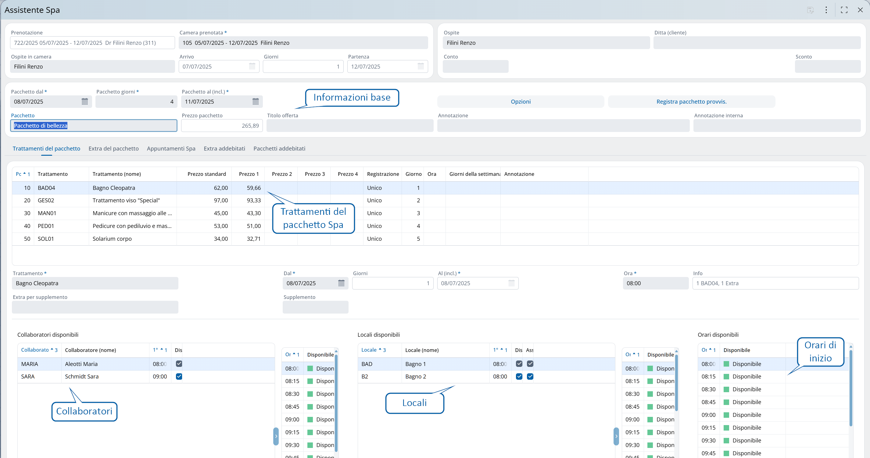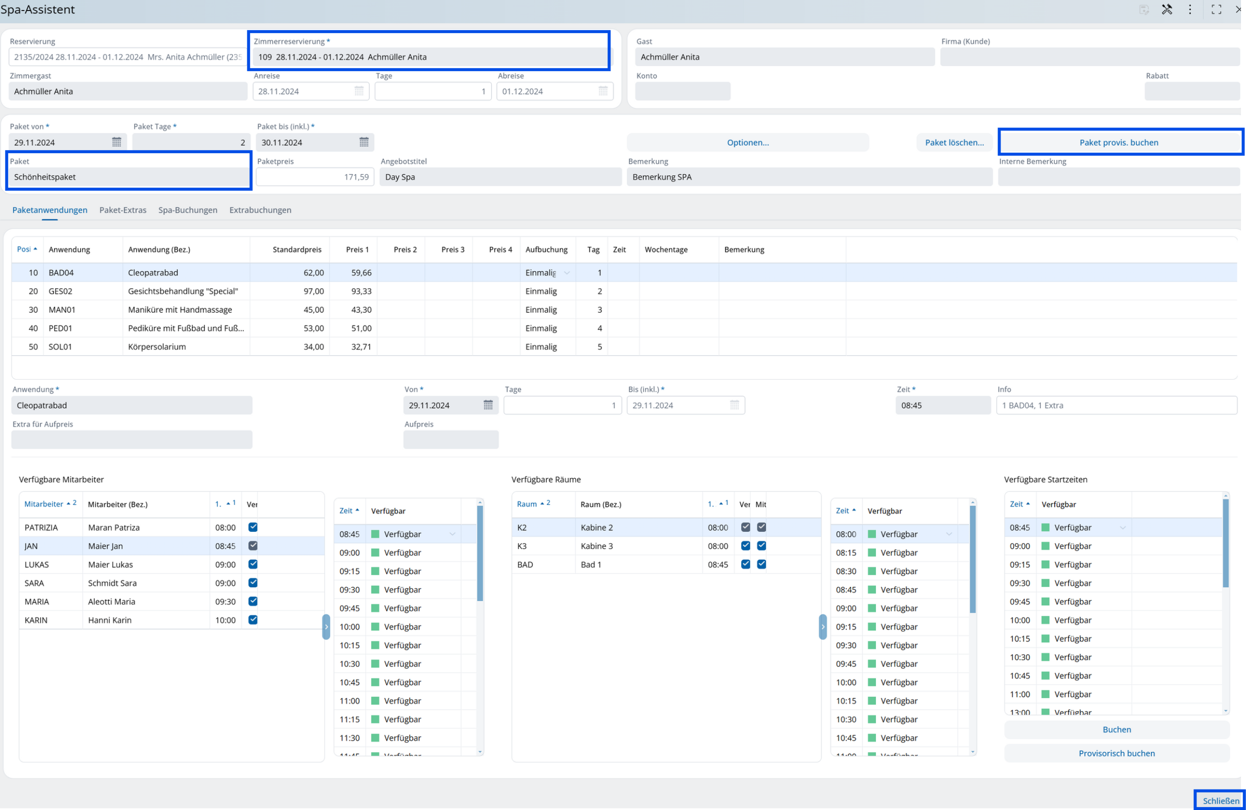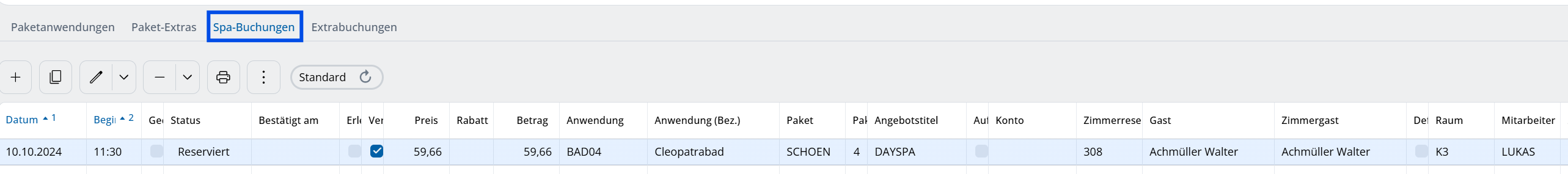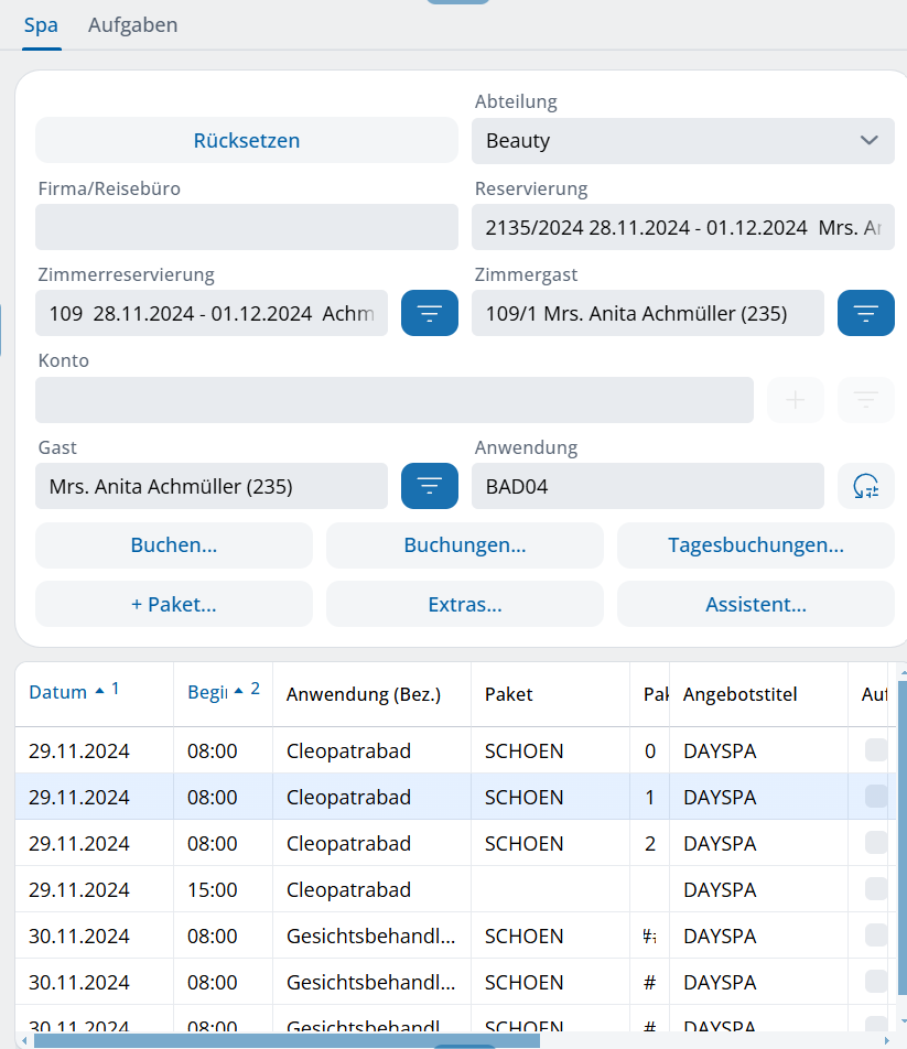 I trattamenti singoli del pacchetto sono ora mostrati nella tabella alla voce Prenotazione / Spa, gli specialisti della spa possono elaborarli ulteriormente.