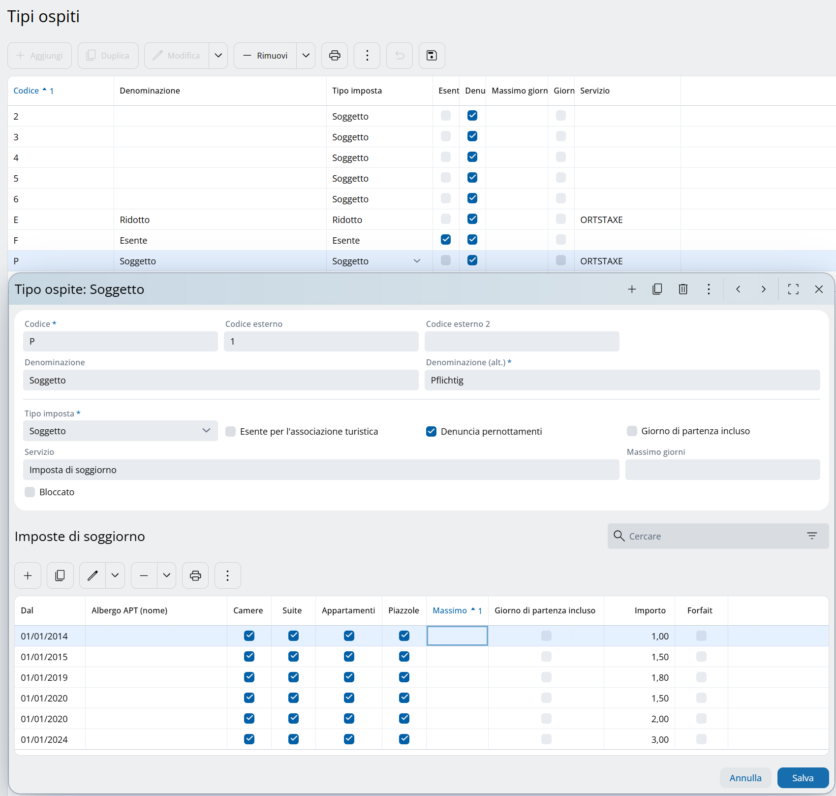 La validità delle tariffe è controllata dalla data in "Dal", per cui una voce è obsoleta dal momento in cui è disponibile una voce più recente per il rispettivo periodo di soggiorno. In parole povere, il software esamina sempre la voce più recente in questione.