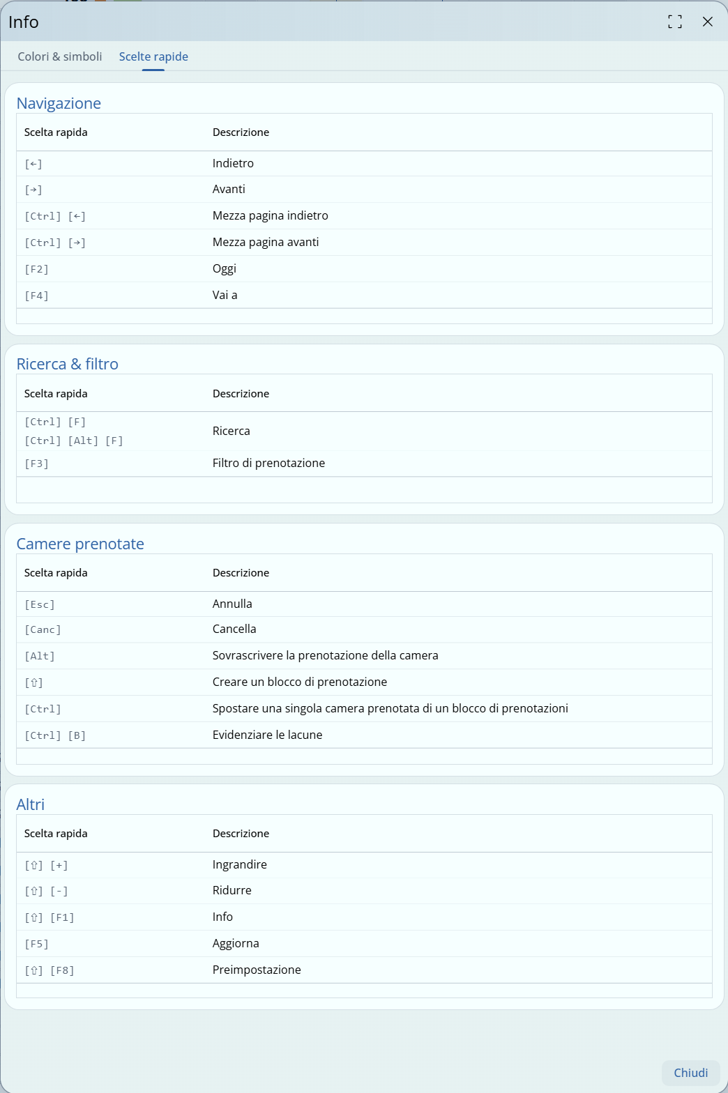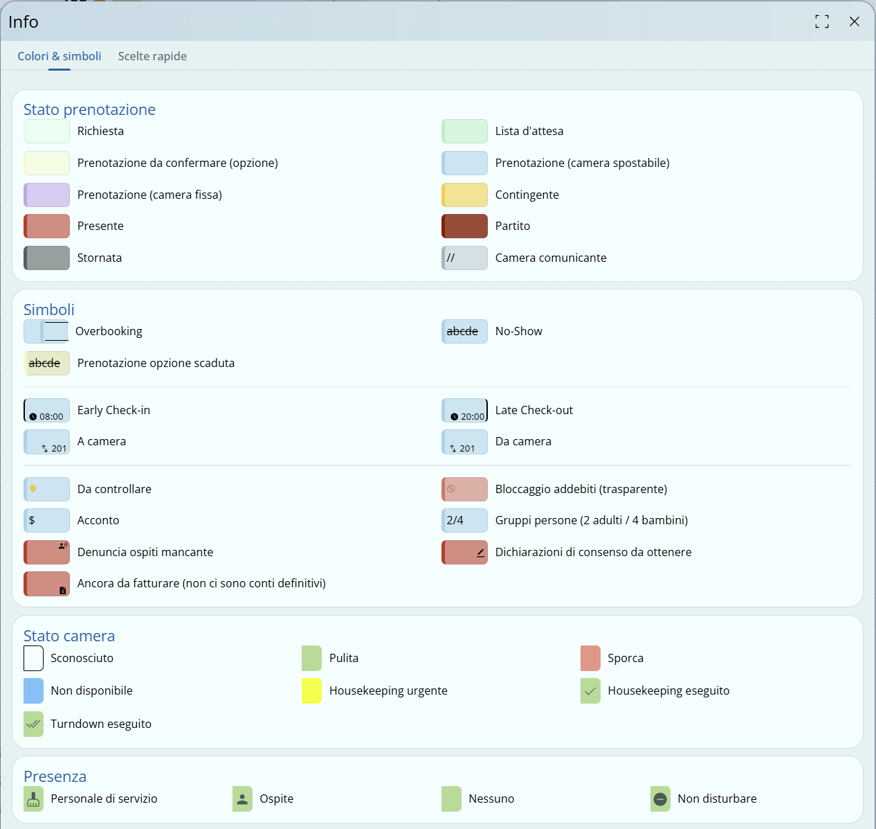| Preimpostazioni Maiusc + F8, Generale, Impostazioni pianta camere e Colori quadro prenotazioni. |