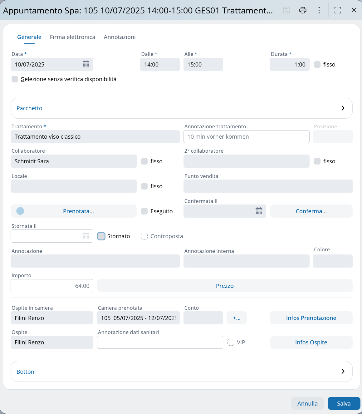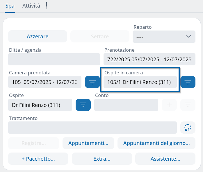 Nella maggior parte delle aree di gestione alberghiera, è sufficiente inserire una "prenotazione" (ad esempio, ordinare una bevanda, fatturare). Nella Gestione Spa è diverso. I trattamenti spa sono rigorosamente personalizzati, e pertanto deve sempre essere assegnato un ospite in camera. Se, per qualsiasi motivo, il nome dell'ospite in camera non è ancora noto, è possibile effettuare solo un appuntamento provvisorio.