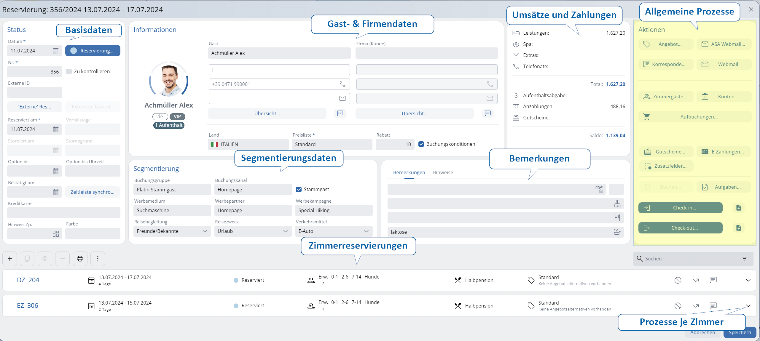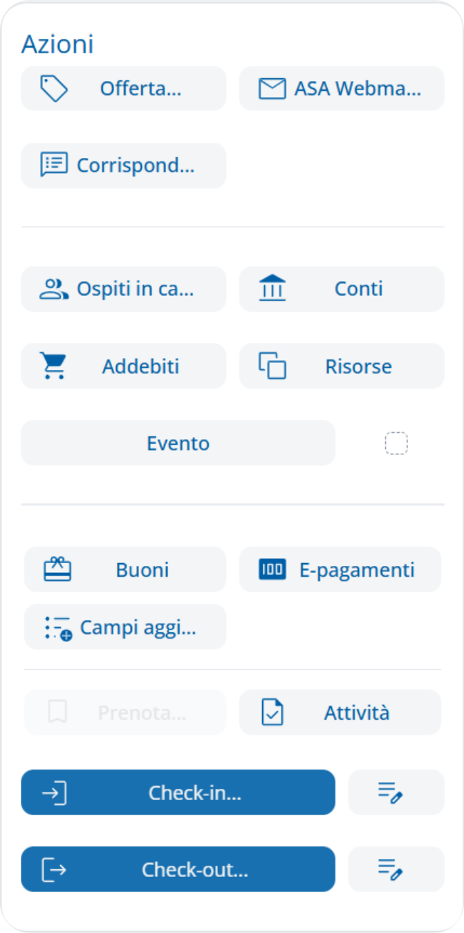 I bottoni hanno numerosi compiti: avviano i processi (ad esempio, invio della conferma, check-in), attivano le prenotazioni (Extra, SPA), costituiscono una "finestra" sui dati in background (visualizzazione del fatturato attuale).