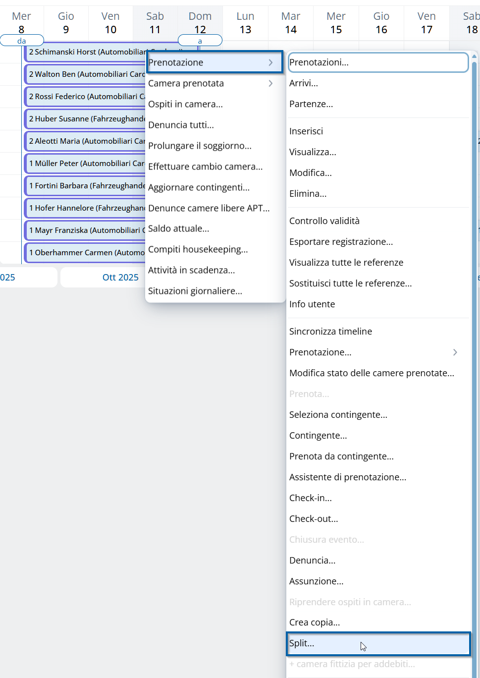 La funzione viene avviata tramite il comando "Split" (ad esempio con clic destro sulla prenotazione nel planning camere o tramite i tre puntini in alto a destra nella prenotazione).