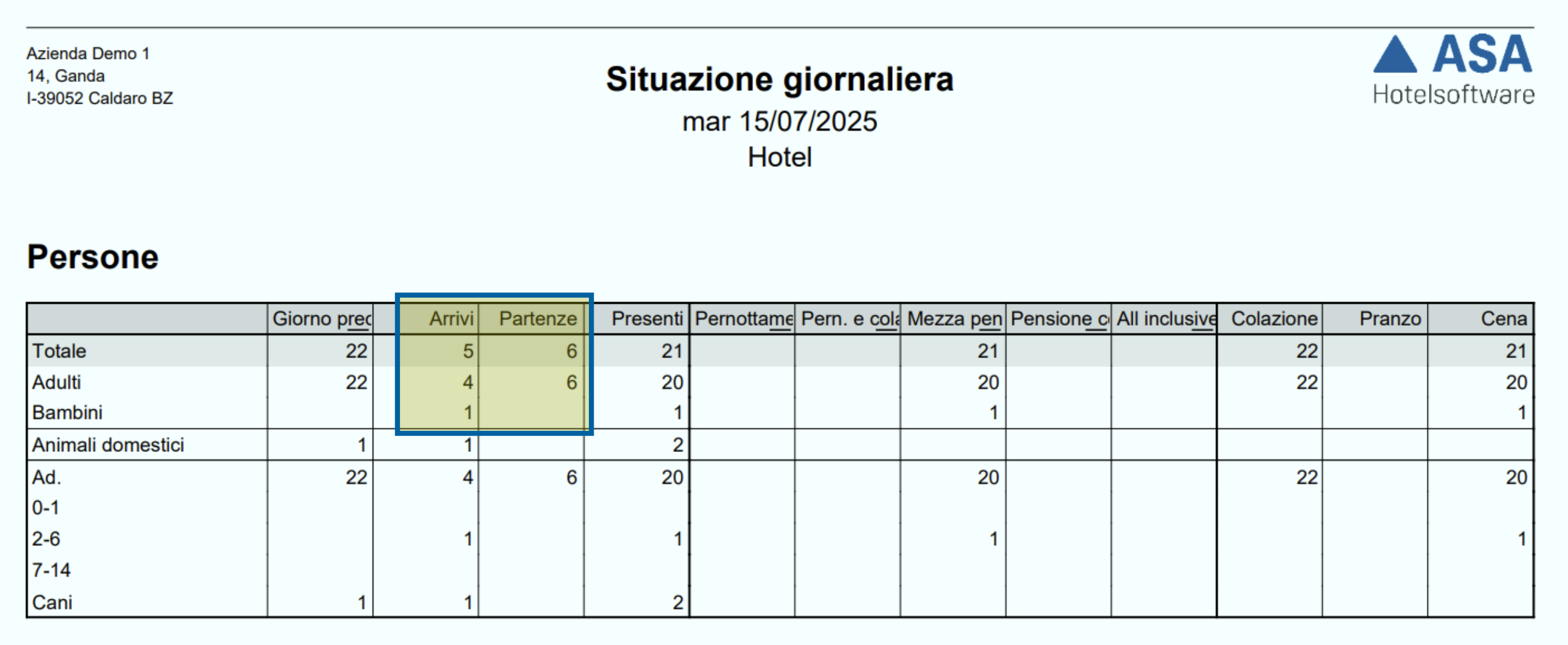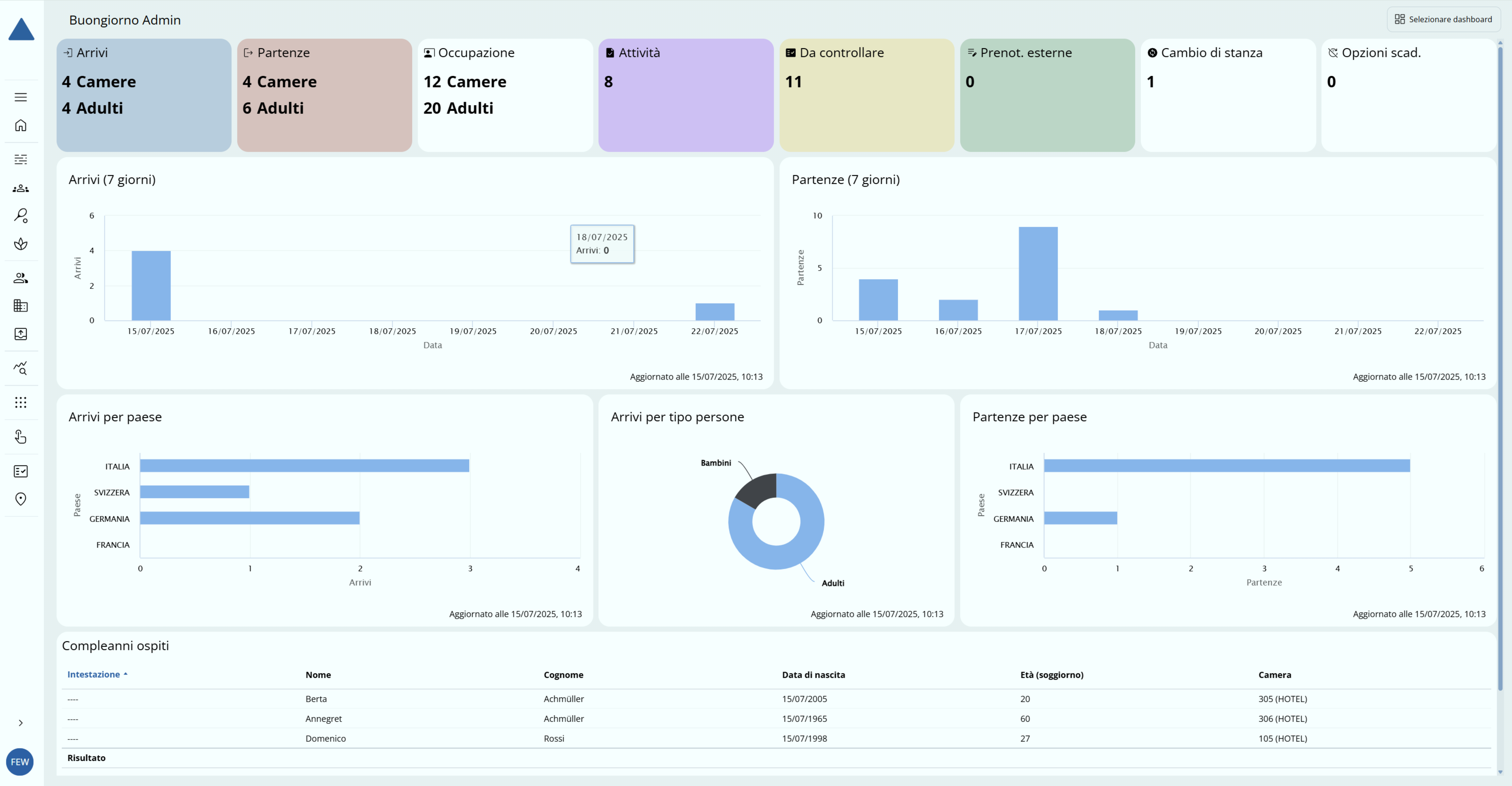 Al di sotto, vi sono diagrammi con informazioni più dettagliate, come gli arrivi/partenze previsti, la suddivisione degli ospiti in arrivo per tipo di persona e l'elenco dei compleanni.