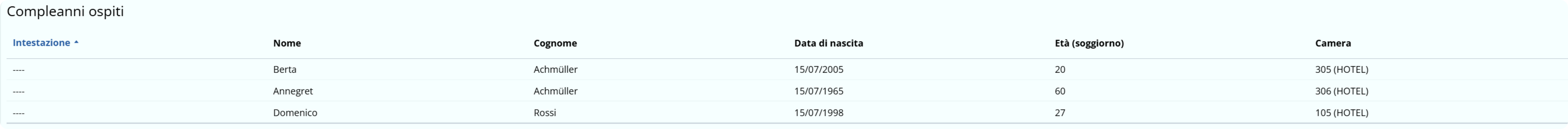 La tabella Compleanni ospiti mostra i dettagli degli ospiti che compiono gli anni nei prossimi 7 giorni e che si troveranno all'arrivo/alla partenza o durante un soggiorno presso la struttura nel giorno del loro compleanno.