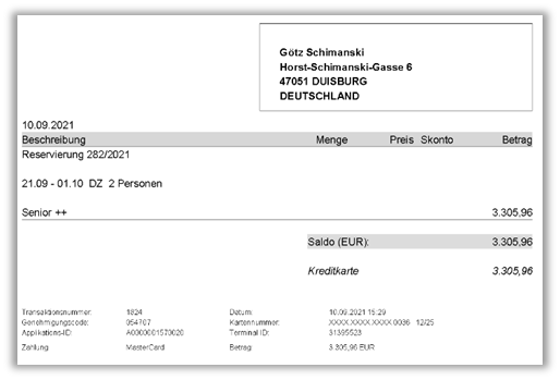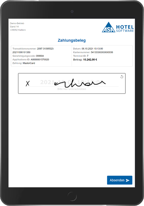 I dati tecnici del pagamento sono salvati in ASA HOTEL (scontrino di pagamento) e stampati sull'"Estratto conto" o sulla "Fattura/ricevuta", secondo l'impostazione. La firma del titolare della carta può essere ottenuta elettronicamente tramite il tablet (stazione ospiti). Il vantaggio: lo scontrino di pagamento va stampato solo una volta per l'ospite, mentre la copia firmata, conservata dall'hotel, viene salvata in ASA HOTEL e può essere ristampata in qualsiasi momento.