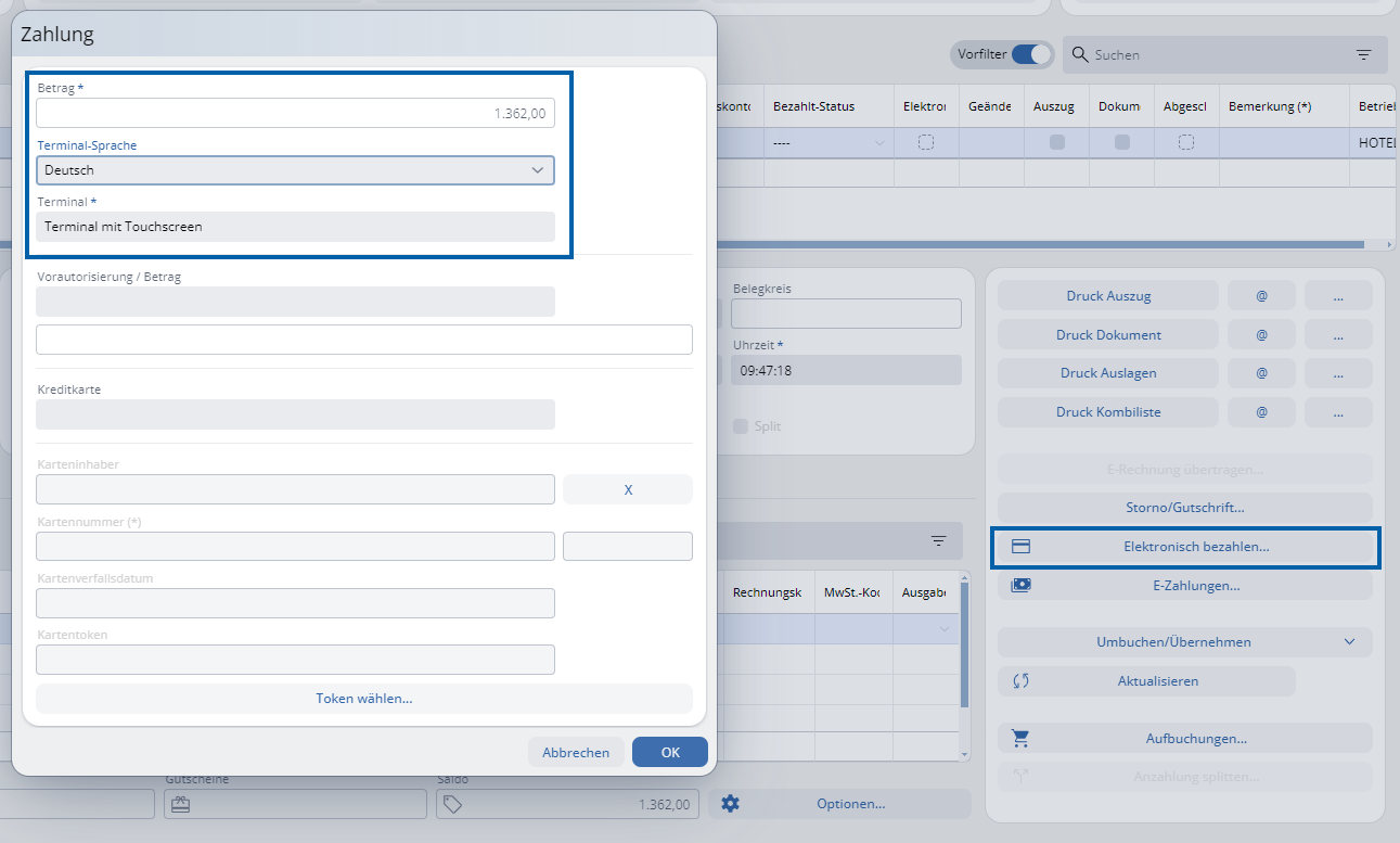 Il pagamento elettronico avviene sempre tramite un conto fatturazione. Le singole rate possono essere pagate nella scheda "Pagamento" oppure l'importo totale può essere pagato tramite il pulsante "Paga elettronicamente" nel conto fatturazione. Si apre la finestra "Pagamento". Il saldo da pagare è già inserito automaticamente. Inoltre, la lingua del terminale viene proposta in base alla lingua dell'ospite e dalla lingua selezionata nelle impostazioni utente del terminale. Premere "OK" per visualizzare l'importo totale da pagare sul terminale. La carta di credito o di debito deve essere avvicinata al terminale e vanno seguite le istruzioni sul display.