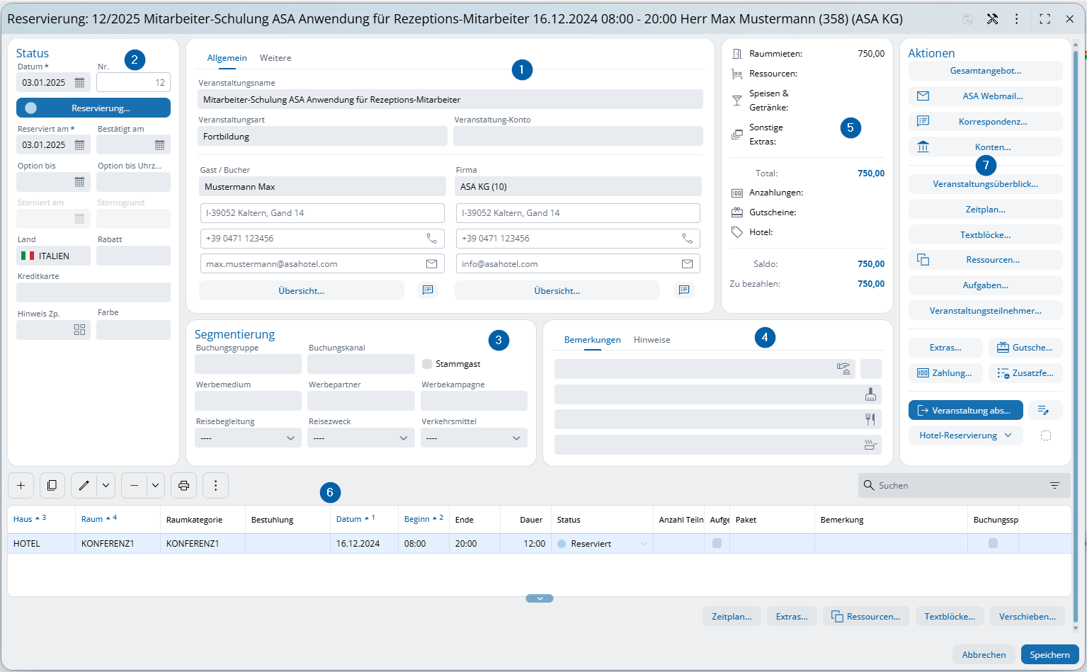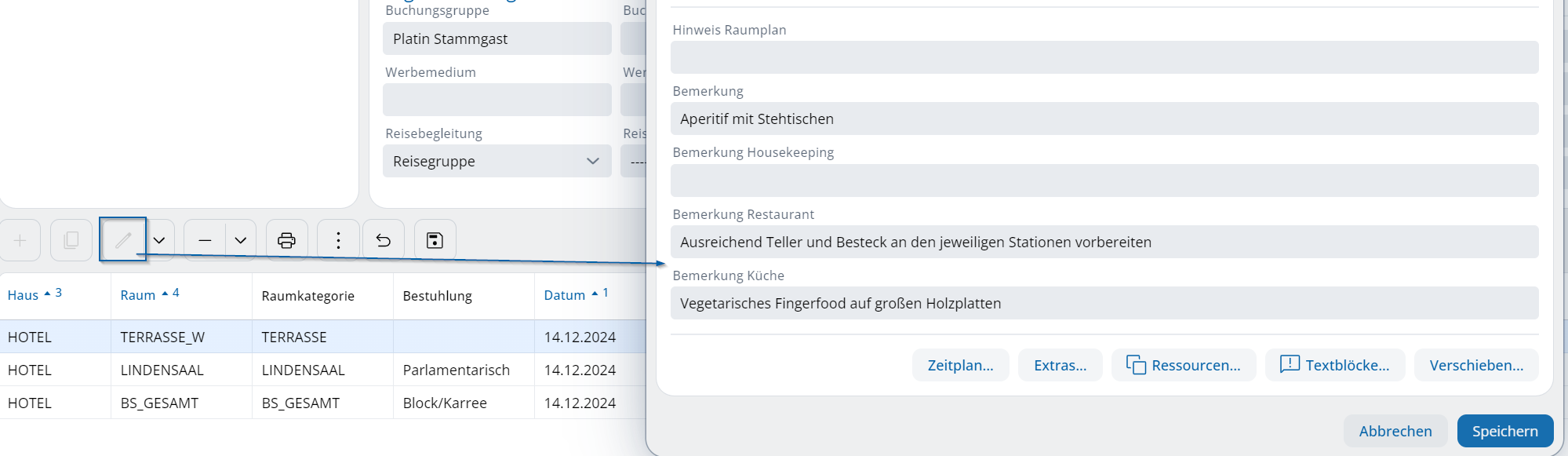 - Tutte le prenotazioni delle sale sono elencate in quest'area. A differenza della prenotazione delle camere, viene creata una prenotazione individuale della sala per ogni giorno. Un evento di tre giorni consiste quindi in tre prenotazioni. Se necessario, è possibile inserire qui la disposizione delle postazioni, il numero di partecipanti, il pacchetto evento e la nota principale (reception/prenotazione) per la prenotazione della sala. Con F2 o la matita (Modifica) hai la possibilità d'inserire commenti per il servizio di housekeeping, il ristorante e la cucina per ogni singola prenotazione di sala meeting. Questi commenti vengono visualizzati nella panoramica sull'evento nella panoramica della rispettiva prenotazione della sala.