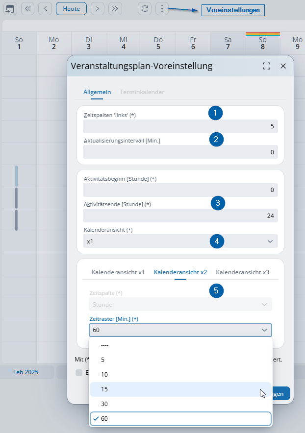 4. Qui puoi impostare la vista predefinita da visualizzare all'apertura del Quadro eventi. Si consiglia di impostare la vista giornaliera (x1) come predefinita, in quanto ciò facilita la navigazione verso altri giorni/periodi.