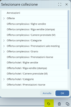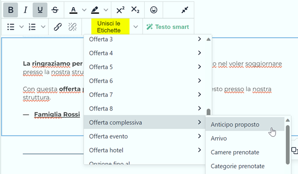 Per inserire i campi di unione della posta ASA HOTEL, fare clic su "Tag di unione" nella barra degli strumenti e selezionare il campo corrispondente dall'elenco. I campi disponibili per l'area selezionata sono mostrati qui. È possibile selezionare altri campi da altre "collezioni":