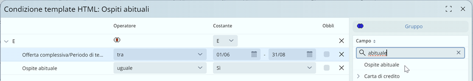 Esempio: si desidera creare template di offerta diversi in base alle stagioni. A tal fine, creare un modello con il filtro "Periodo/arrivo (giorno/mese)" e inserire le date desiderate. Questo potrebbe essere ampliato con ulteriori filtri e, ad esempio, si potrebbero creare template separati per gli ospiti abituali e per i nuovi ospiti. Per farlo, è sufficiente impostare un altro filtro "Ospite abituale".