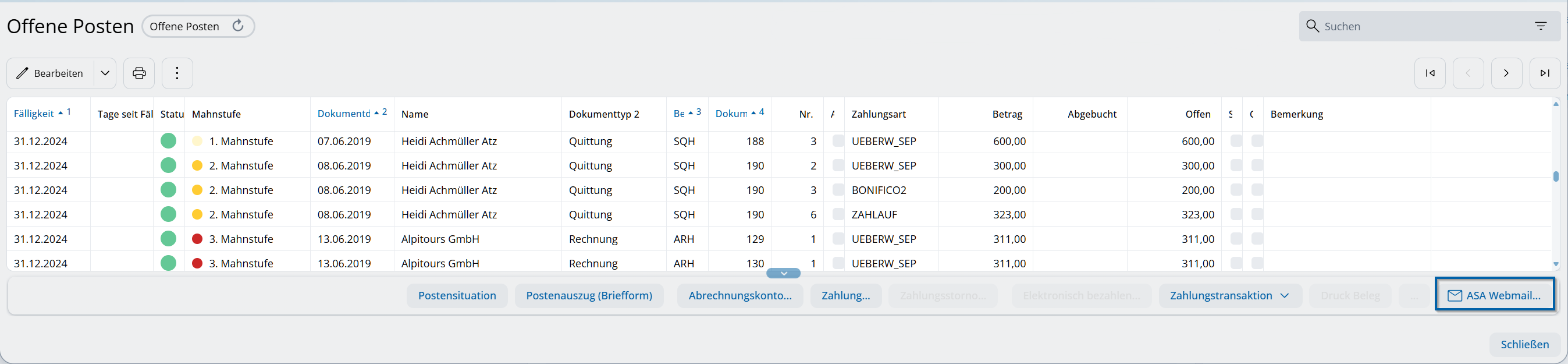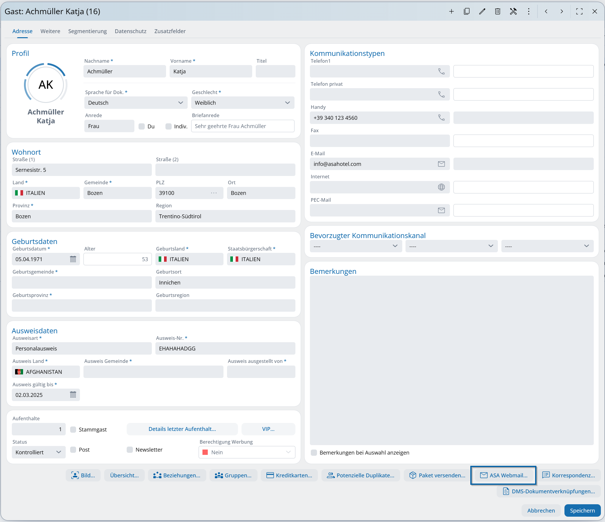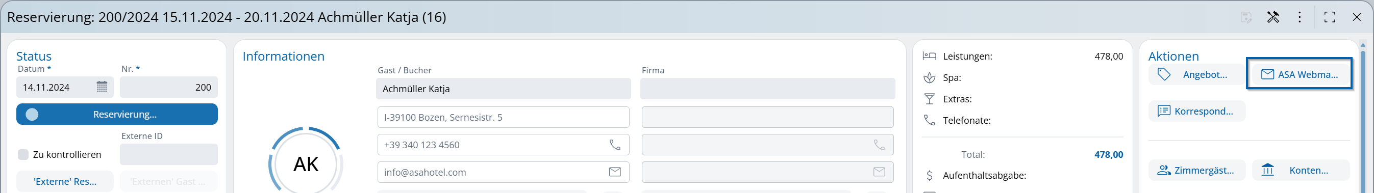 In diversi moduli (modulo di prenotazione, voucher, applicazione Spa ecc.) con il modulo ASA Webmail attivo si trova un pulsante corrispondente. Cliccandolo si apre ASA Webmail con i modelli corrispondenti all’area selezionata.