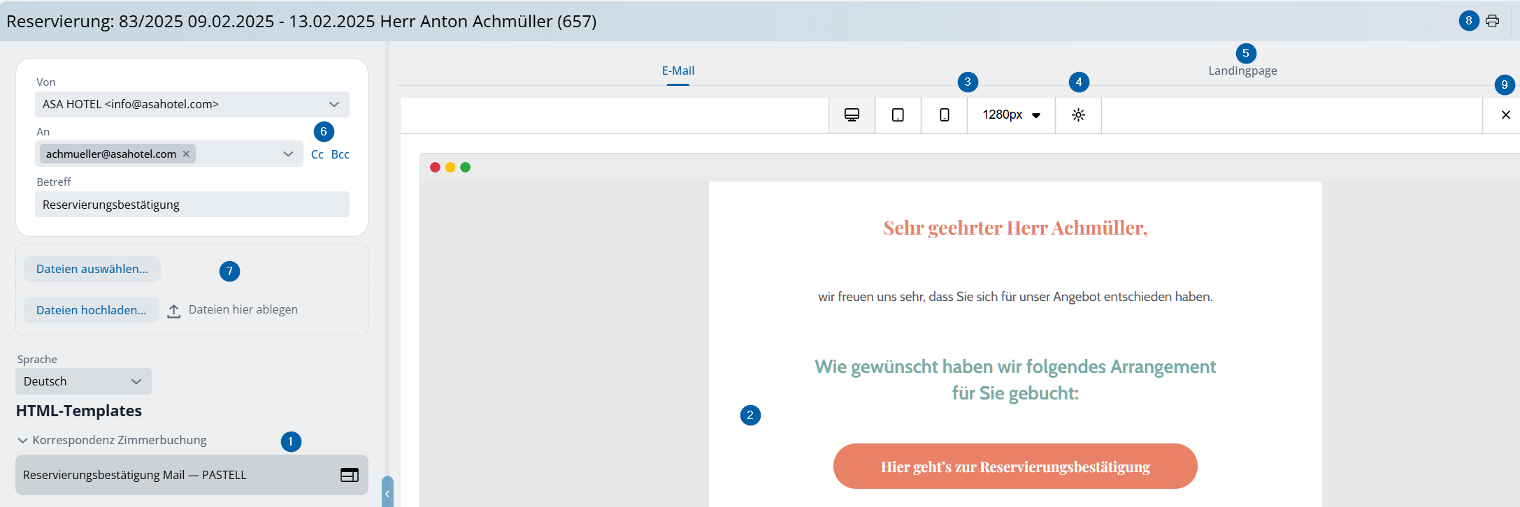 Se il modello selezionato è contrassegnato come landing page, è possibile passare qui tra l’anteprima della mail in HTML e quella della landing page (5).