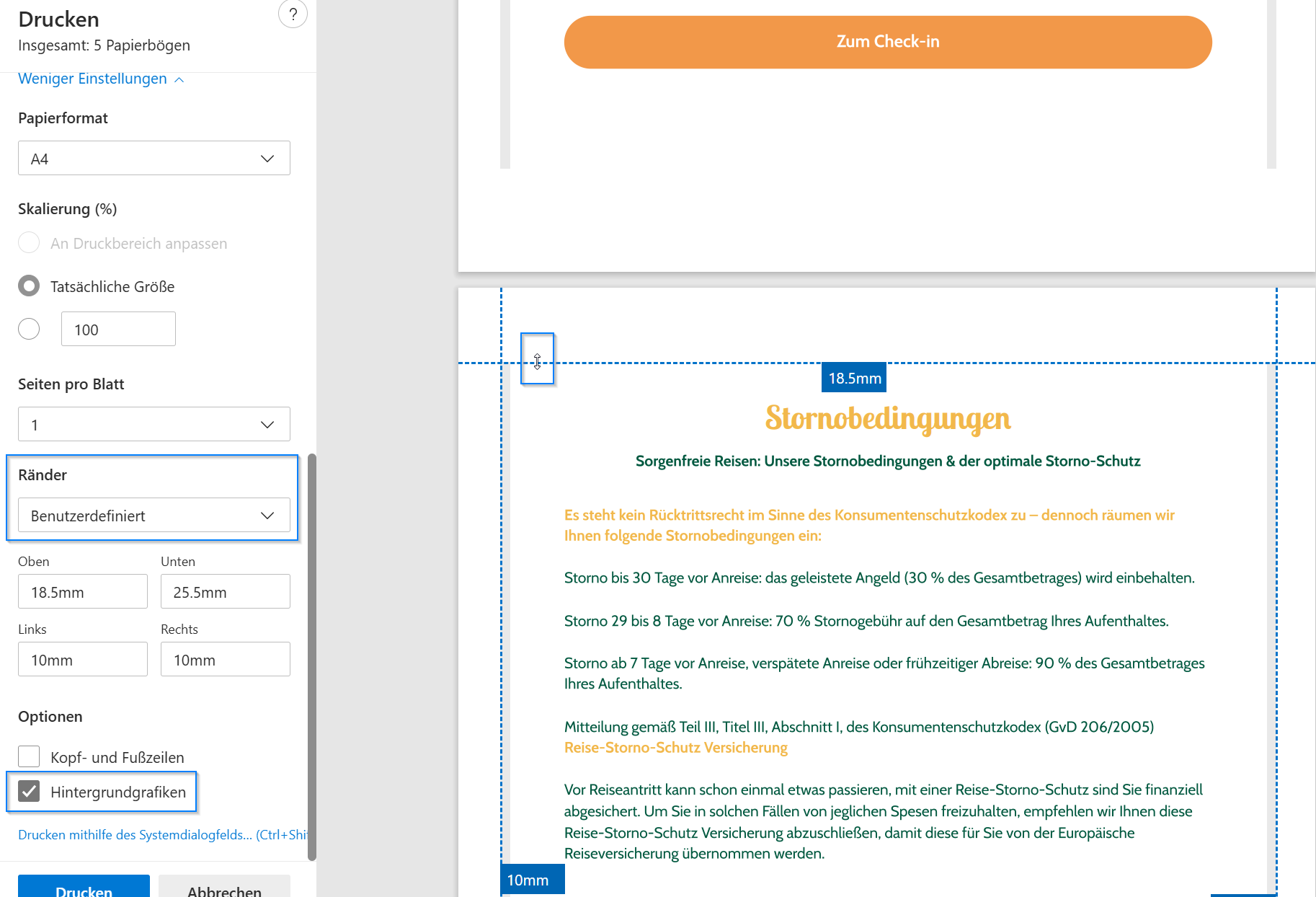 Nelle impostazioni di stampa si consiglia di impostare i margini su personalizzato se necessario e di attivare la stampa degli sfondi.