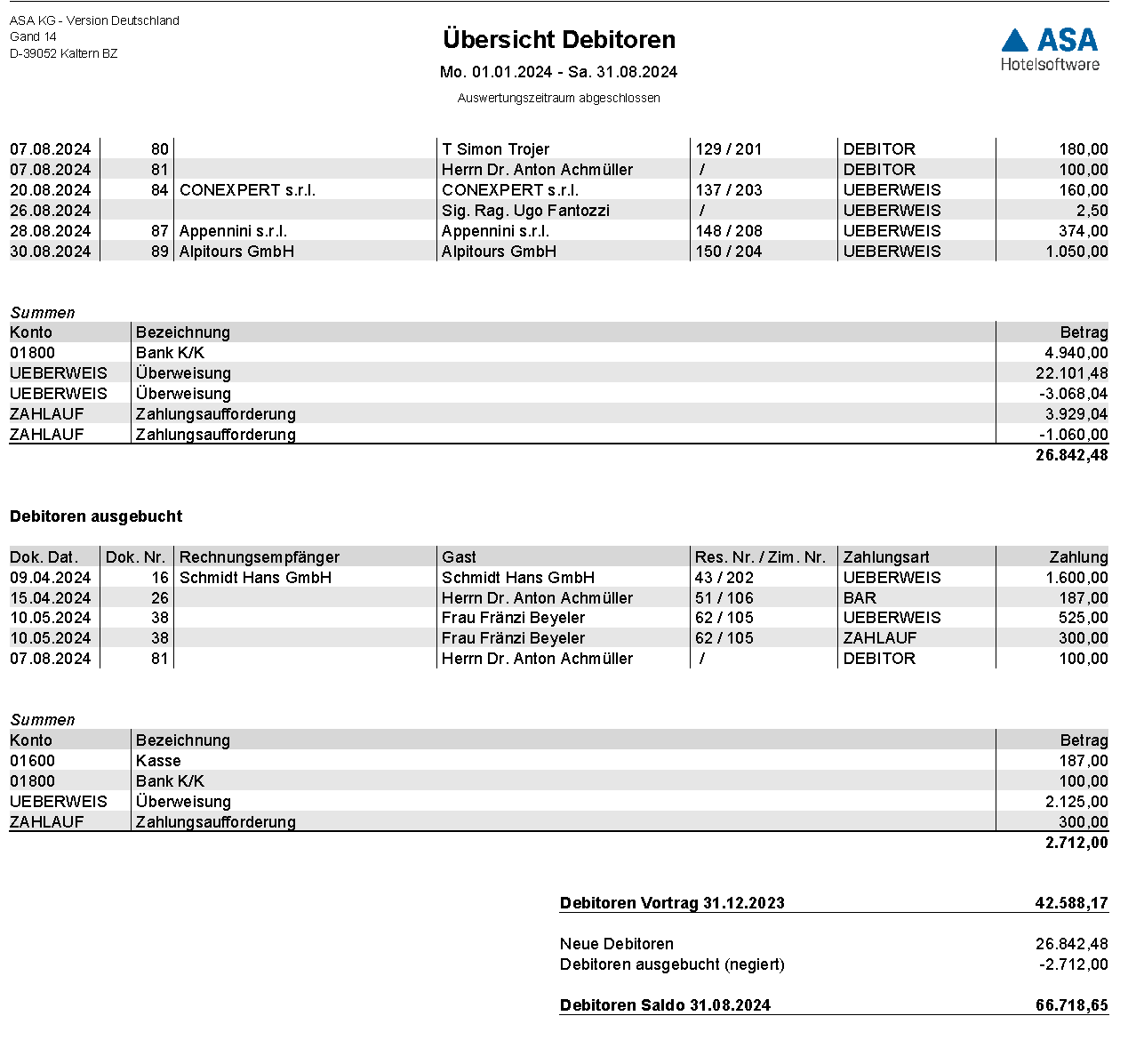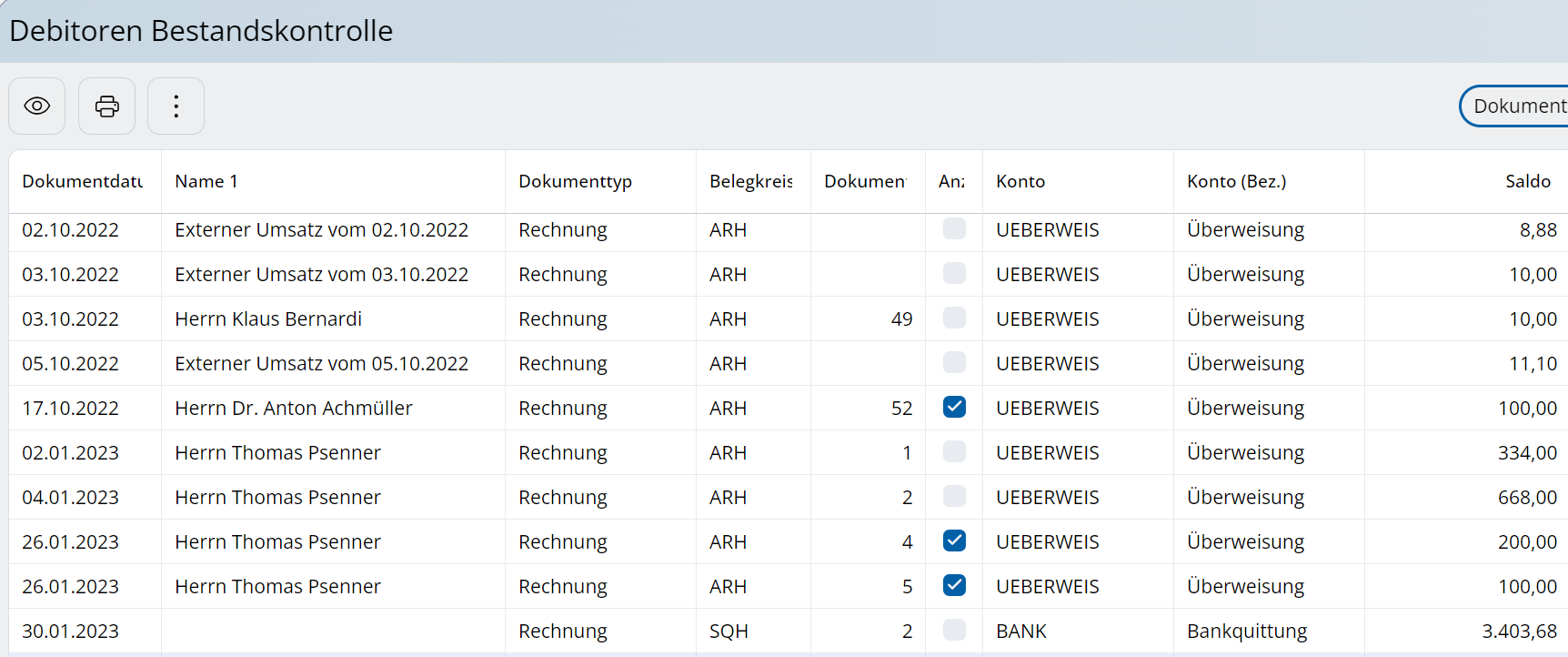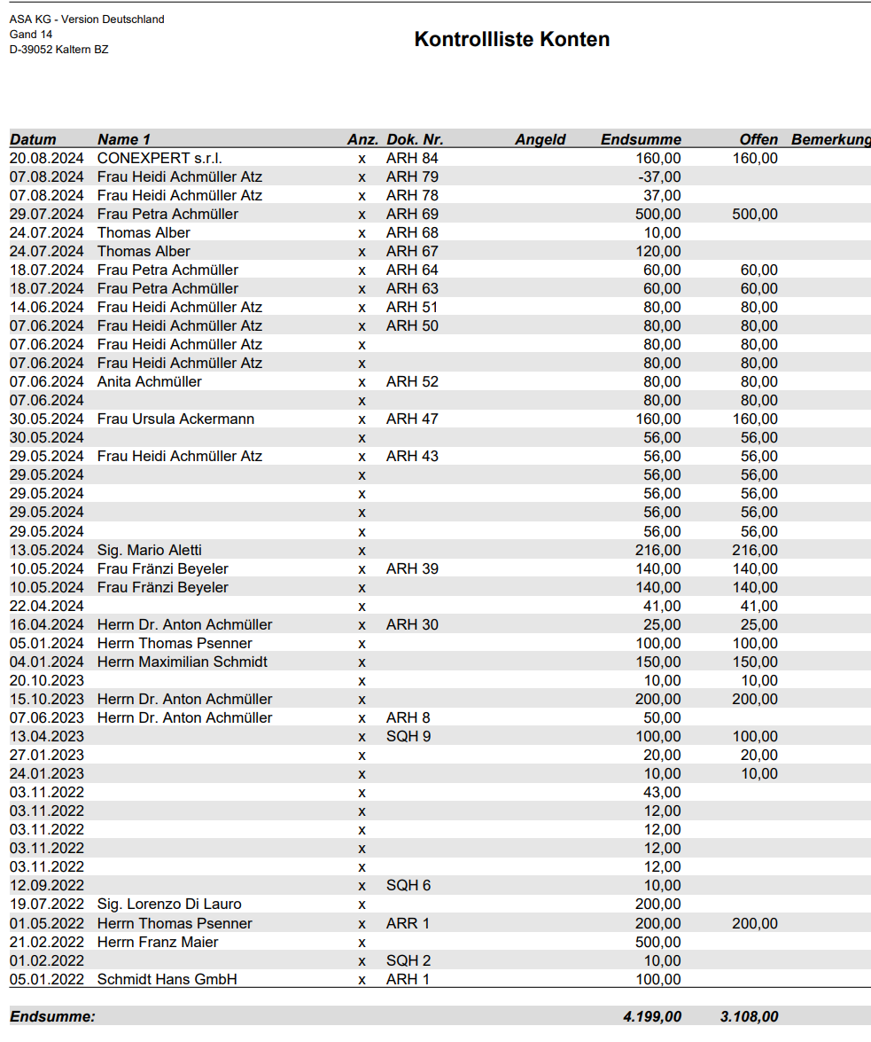 Durante i controlli tutti i debitori (compresi quelli dei periodi precedenti) sono elencati in dettaglio fino alla data di riferimento. Il totale deve corrispondere al saldo debitori. Il motivo delle differenze è solitamente l'inserimento errato dei saldi iniziali dei debitori.