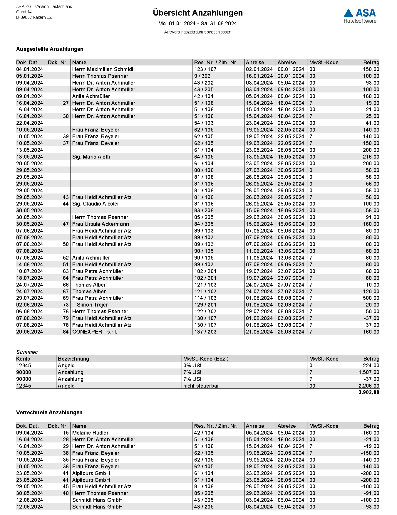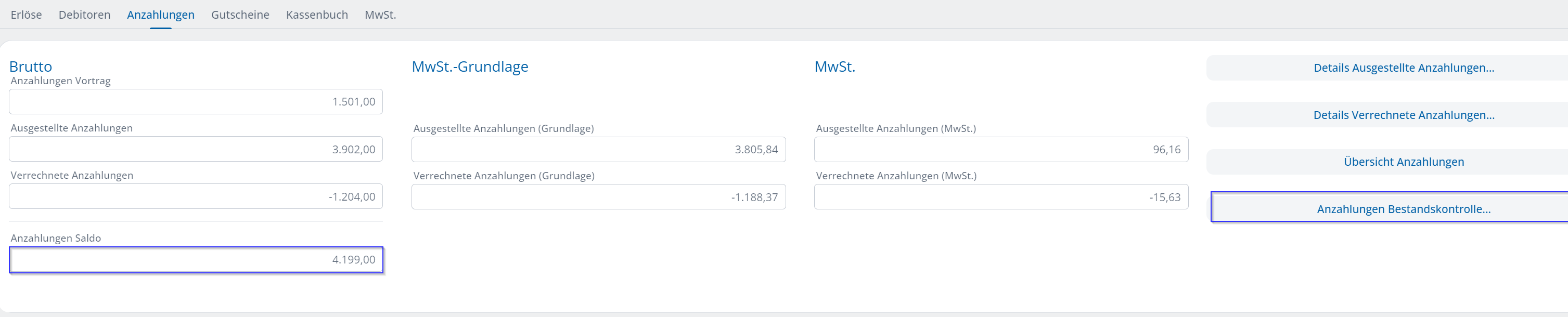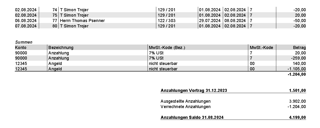 Come per i debitori, durante i controlli tutti gli acconti compensati (compresi quelli dei periodi precedenti) sono elencati in dettaglio fino alla data di riferimento. Il motivo delle differenze con il saldo degli anticipi (schermata precedente) è solitamente l'inserimento errato dei saldi iniziali degli anticipi.