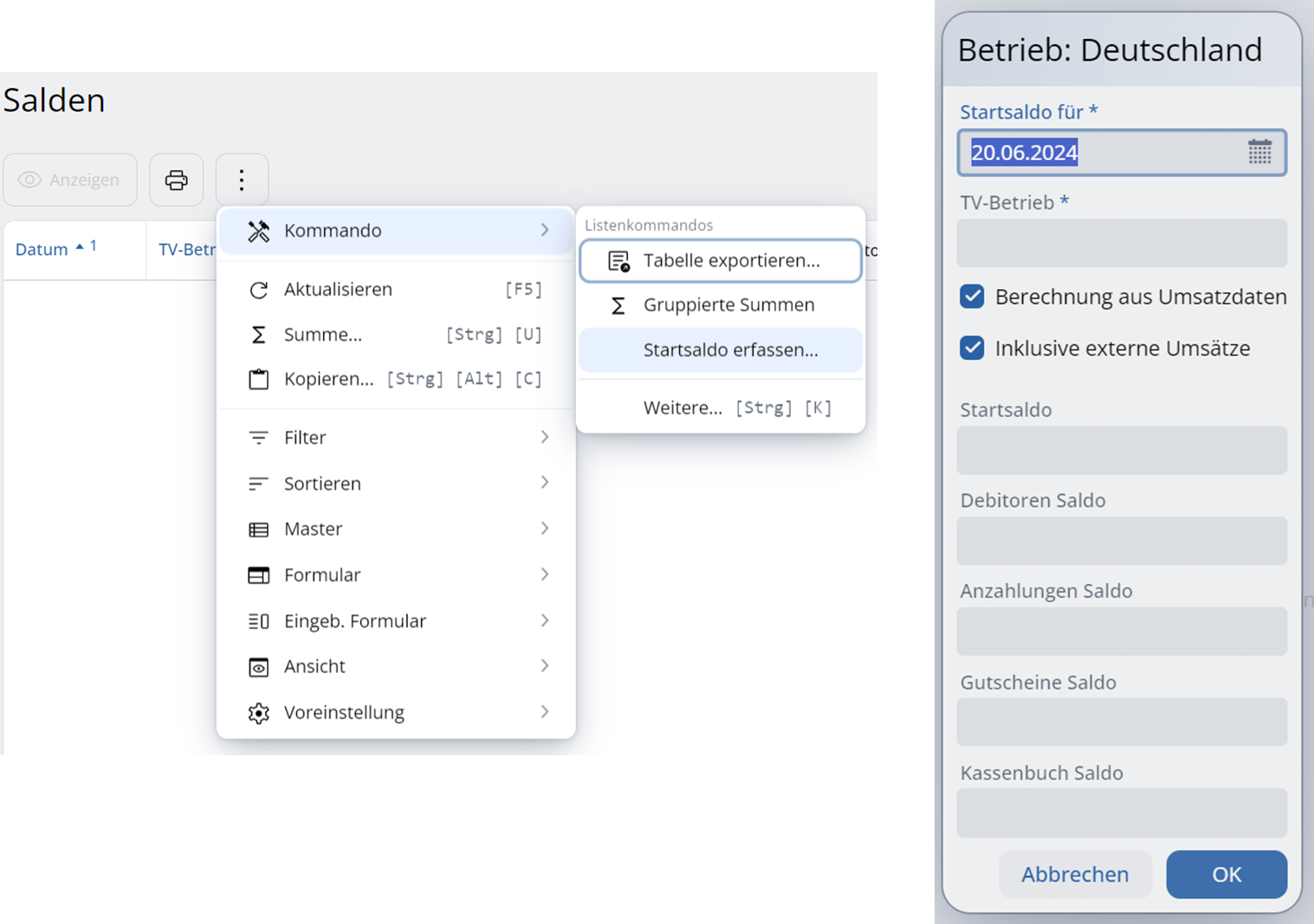 All'avvio, i saldi iniziali possono/devono essere inseriti in Hotel » Statistiche »Dati » Saldi per ogni albergo ATP con il comando di lista "Registra saldo iniziale" per qualsiasi data d'inizio; questo comando può essere eseguito solo una volta.