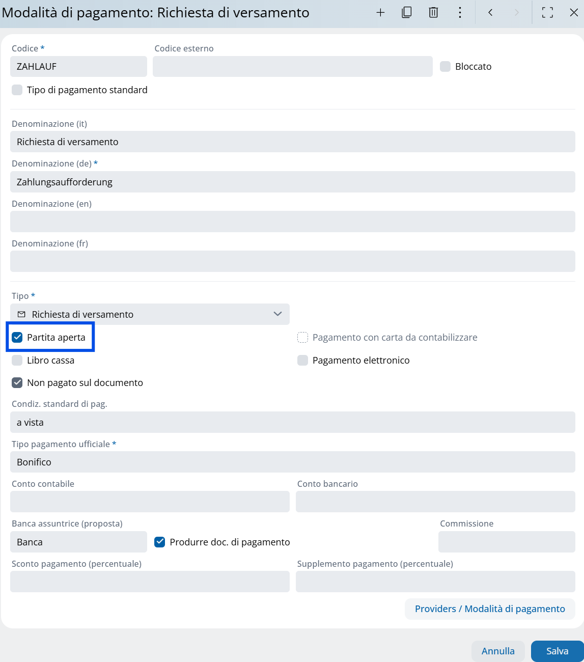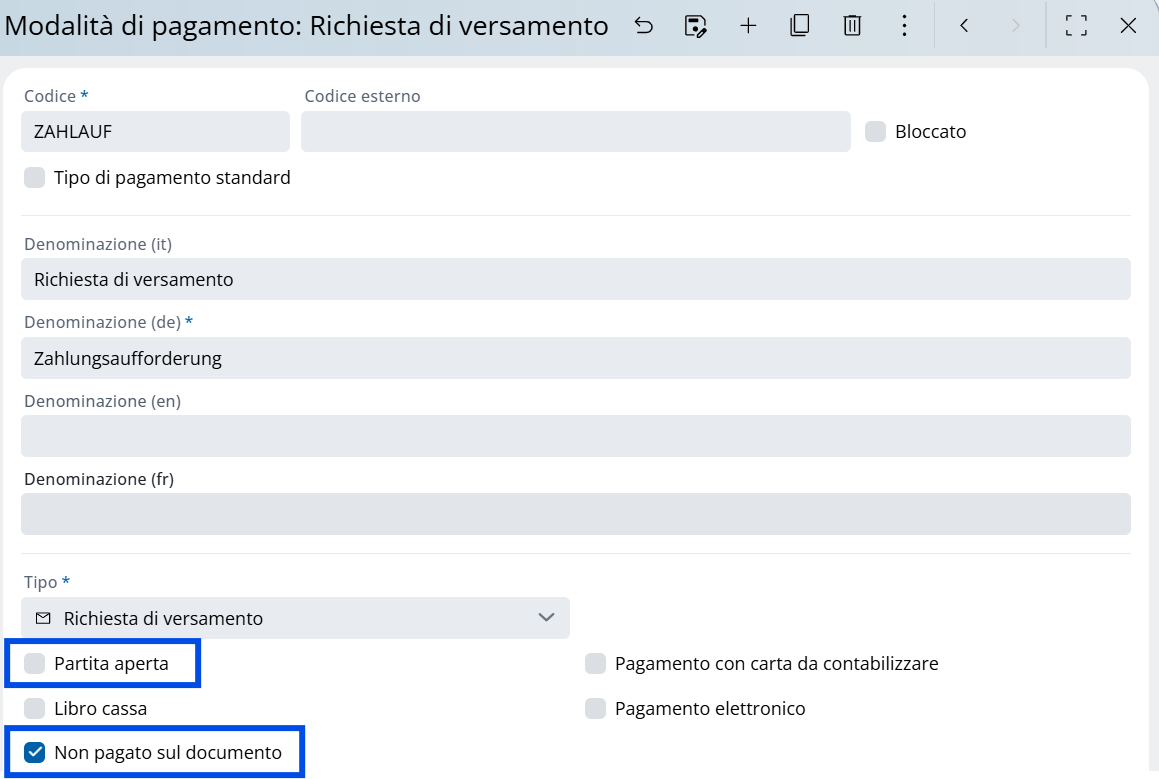Se le partite aperte non vengono controllate tramite ASA, ma tramite la contabilità, il flag "aperto" può essere disattivato per i tipi di pagamento a debito. Ciò significa che questi conti non devono essere eliminati in ASA. Per assicurarsi che il conto fatturazione mostri che la fattura non è ancora stata pagata, è possibile attivare il flag "Non pagato sul documento".