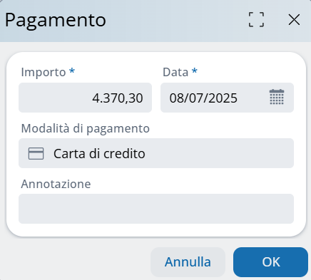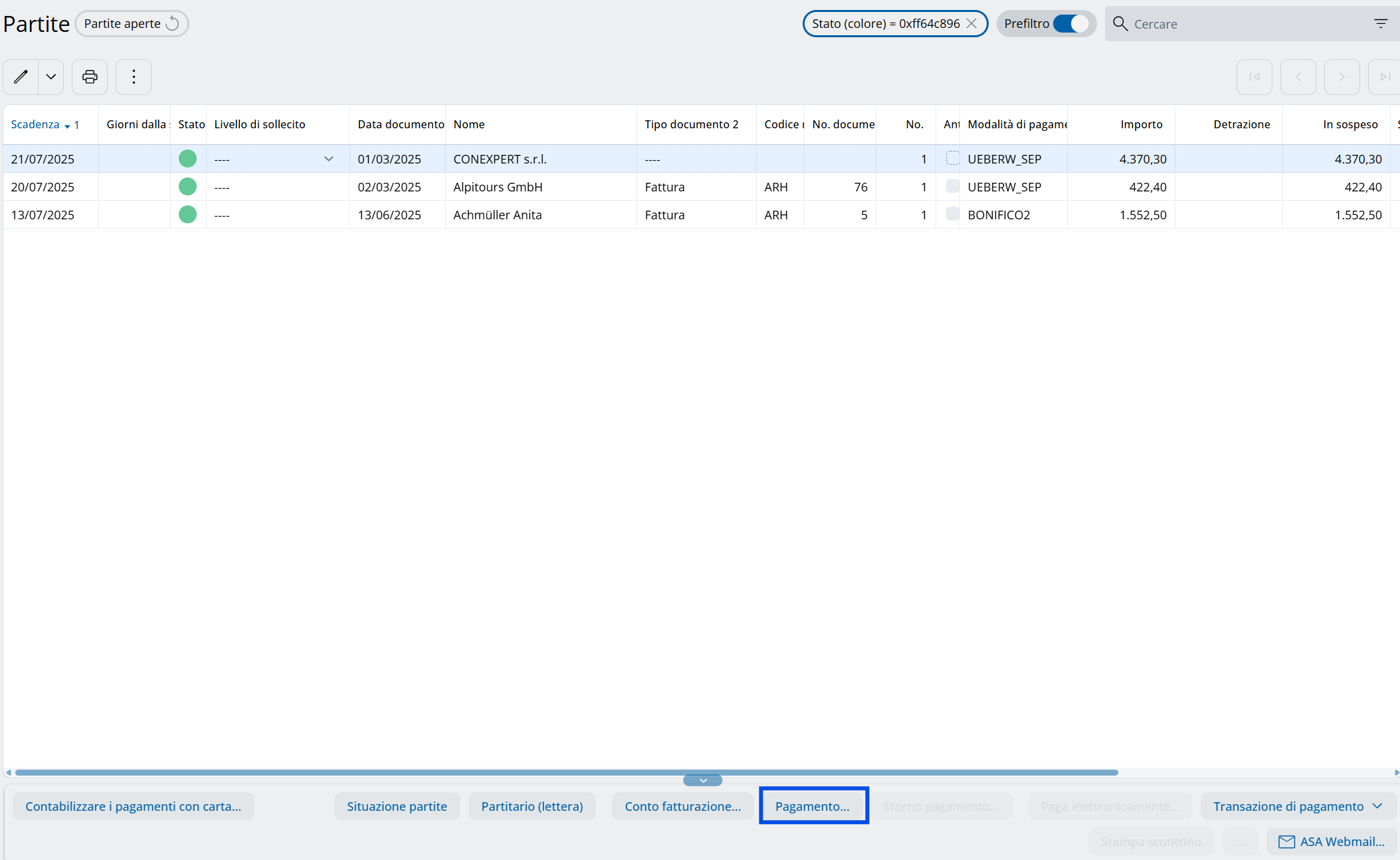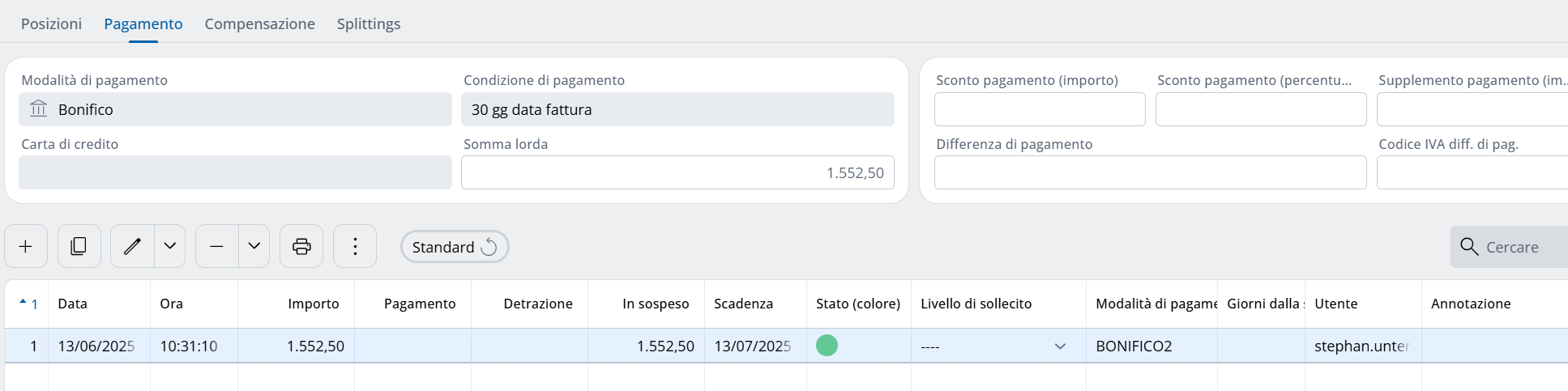 Con il bottone "Pagamento" nelle partite o nelle rate, viene pagata una fattura aperta o parte di essa: