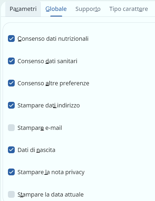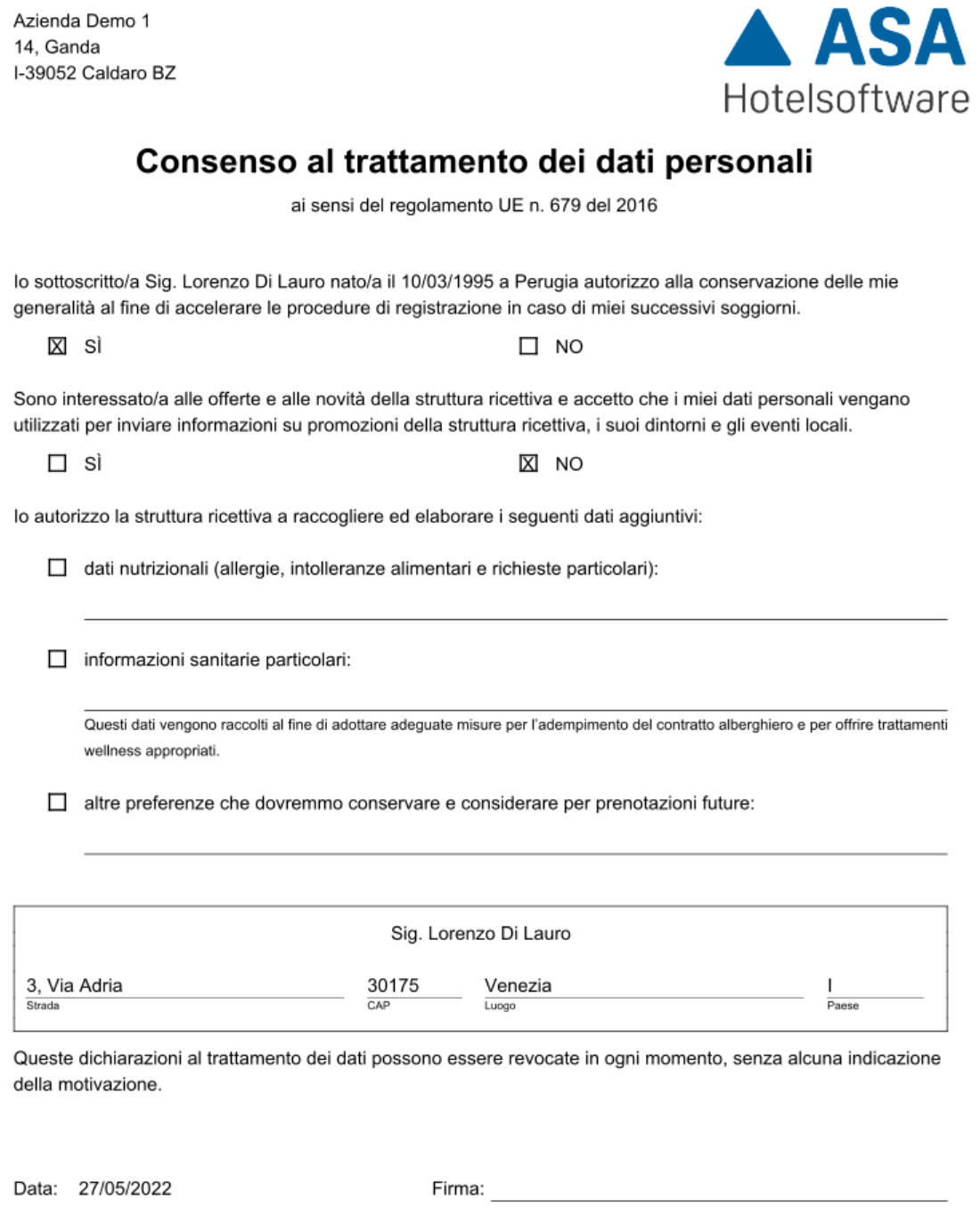I moduli di testo "Informazioni sanitarie", "Allergie/intolleranze alimentari" e "Altre preferenze" possono essere attivati o disattivati. È anche possibile stampare le date di nascita dell’ospite, l’indirizzo e-mail (versione 17.05a) e una individuale nota privacy sulla dichiarazione di consenso. Questa nota privacy può essere anche inserita sotto Impostazioni » Azienda » Azienda » Altri Dati » Dichiarazione Privacy.