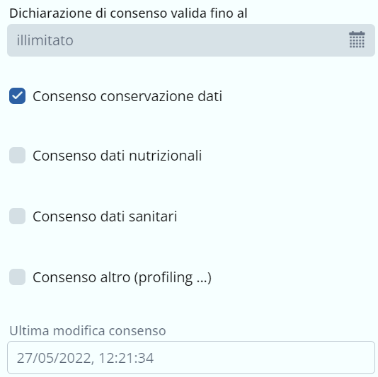 - Il “Consenso conservazione dati” deve essere attivato se l'ospite accetta il trattamento e la conservazione dei propri dati per i soggiorni futuri (primo paragrafo nel modulo di consenso) e verrà attivato automaticamente se è stato impostato il flag su Consenso pubblicità. Al fine di facilitare l'aggiornamento manuale del Consenso, quando viene attivato il consenso alla conservazione dei dati, la data corrente viene inserita come data dell'Ultimo consenso.