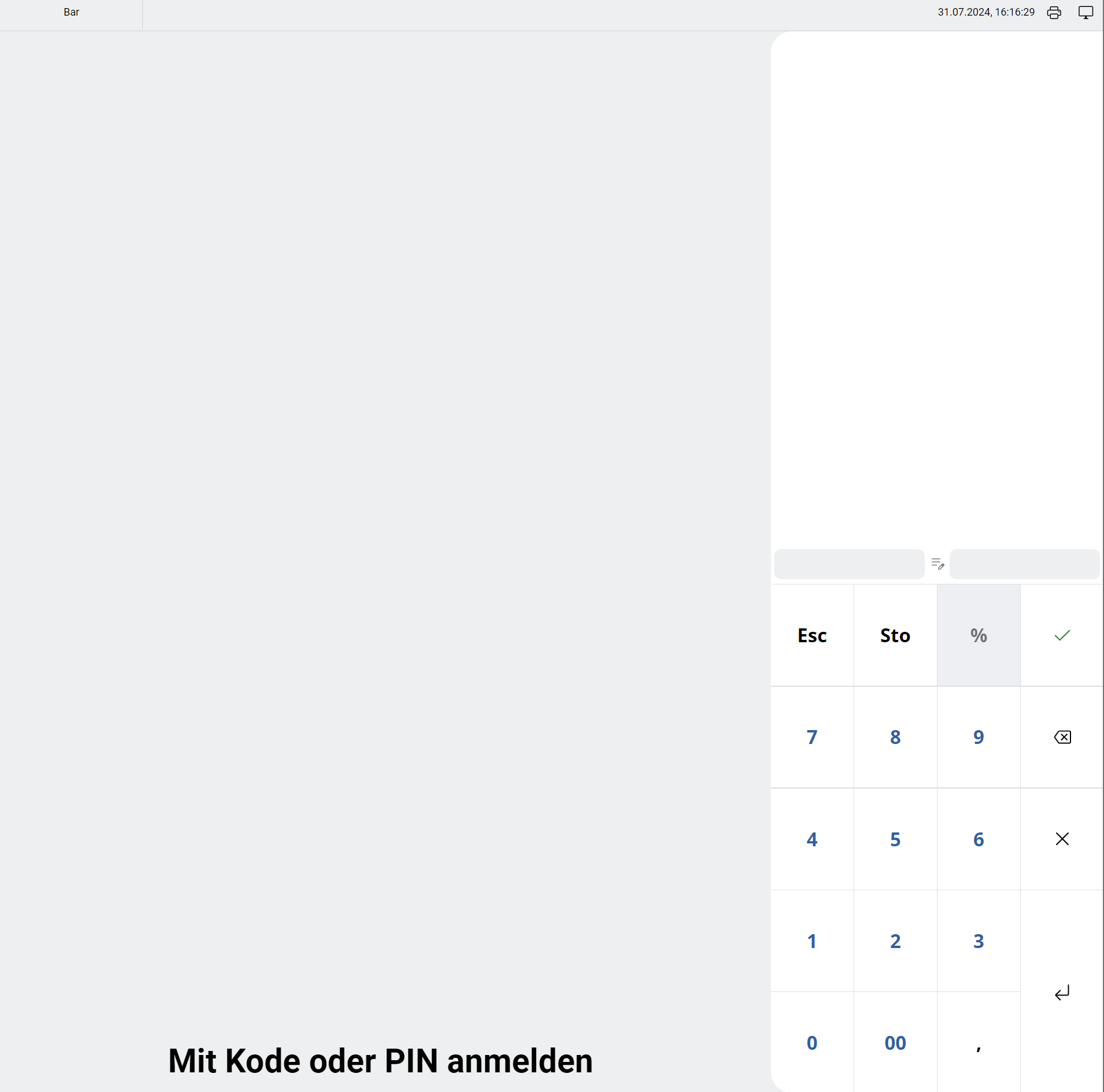 . Inserendo un numero e cliccando su questo pulsante, il numero viene assegnato come numero di tavolo alla camera attiva. Sono ammessi anche numeri decimali. Il numero del tavolo viene stampato sugli ordini e ricevute secondo le impostazioni di stampa globali. È possibile annullare il numero assegnato tramite il tasto Storno.