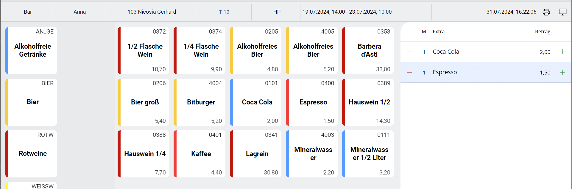 - La chiusura e la registrazione sulla camera avvengono tramite il tasto di chiusura (spunta verde). A seconda delle impostazioni, viene stampata una ricevuta per l’ospite e l’ordine corrispondente nei luoghi di produzione.