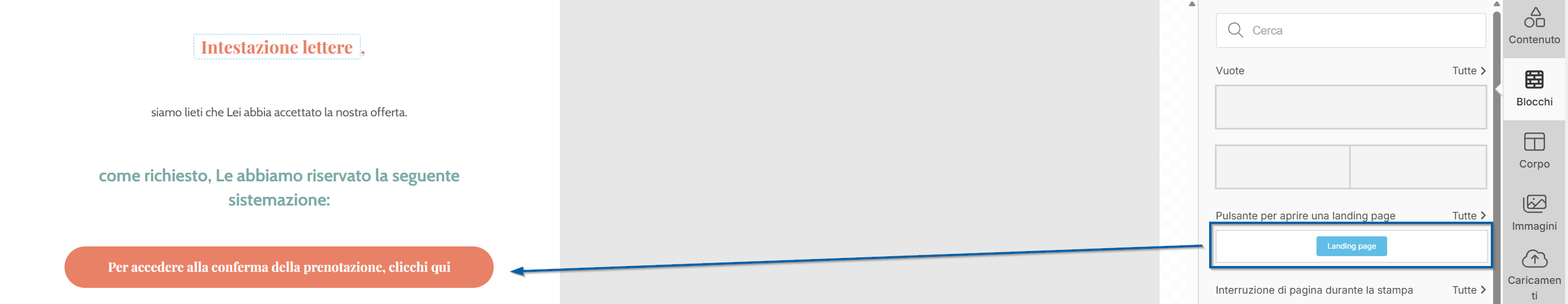Un pulsante è memorizzato nel design della posta HTML, che deve essere fornito con l'URL {{HTMLTemplate_LandingpageLink}} nel tipo di azione. Questo pulsante viene memorizzato come modello nei blocchi dei template etichettati come landing page. In questo modo si evita di dover inserire l'URL.