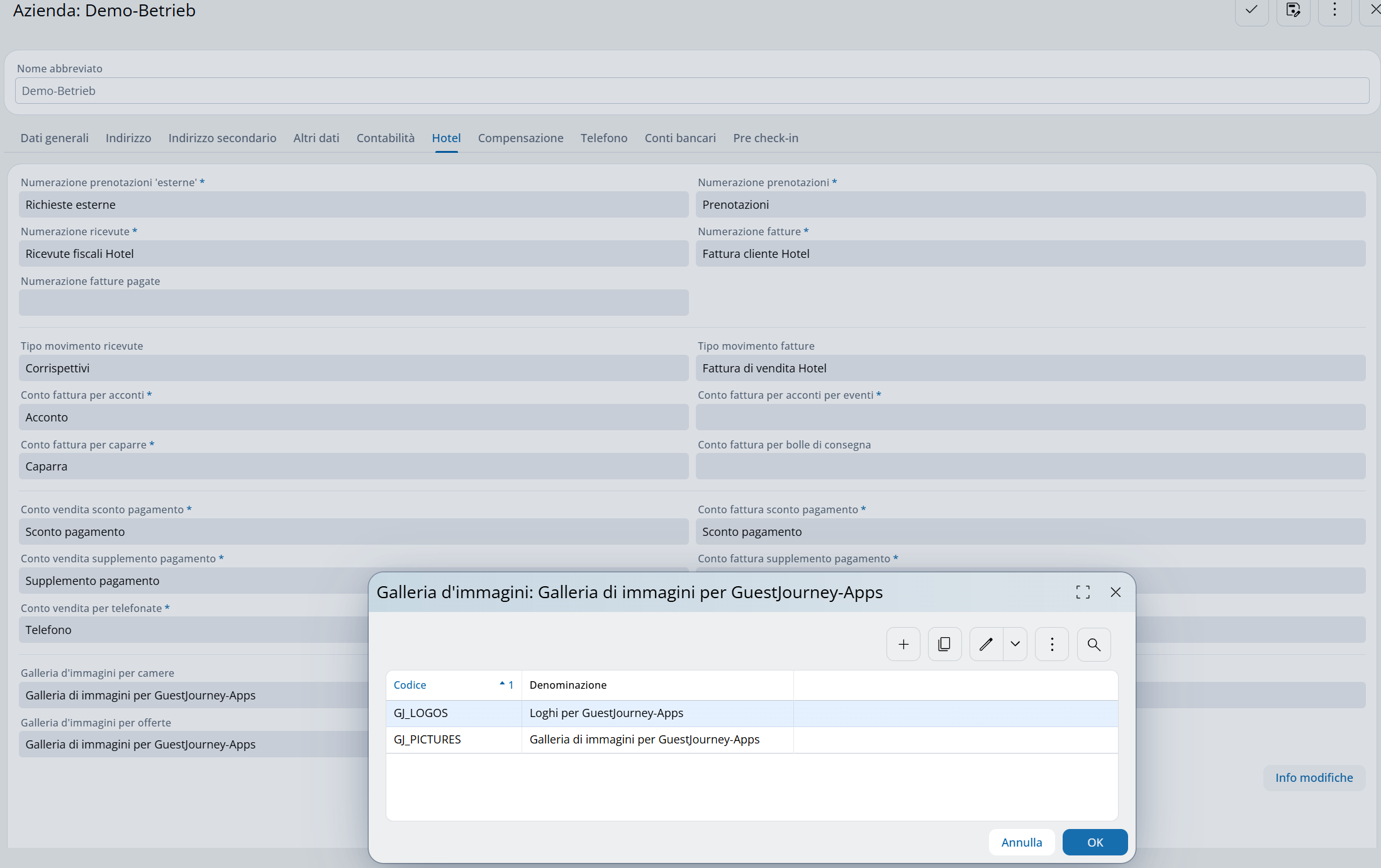 Il blocco di offerta predefinito contiene la possibilità di trasferire fino a due immagini della camera e la descrizione della camera direttamente da ASA. A tal fine, è necessario inserire la descrizione della camera in Menu » Hotel » Preferenze » Categorie e aggiungere le immagini e/o la planimetria alla galleria immagini. Per attivare la galleria immagini, deve essere memorizzata la galleria immagini corrispondente per le camere e le offerte in Menu -> Configurazione » Funzionamento » Funzionamento » Hotel. Inoltre, sotto Menu » Configurazione » Sistema » Ambiente » Collegamenti condivisi devono essere memorizzati il sottodominio e la porta corrispondente del tunnel (nella maggior parte dei casi ciò avviene automaticamente).