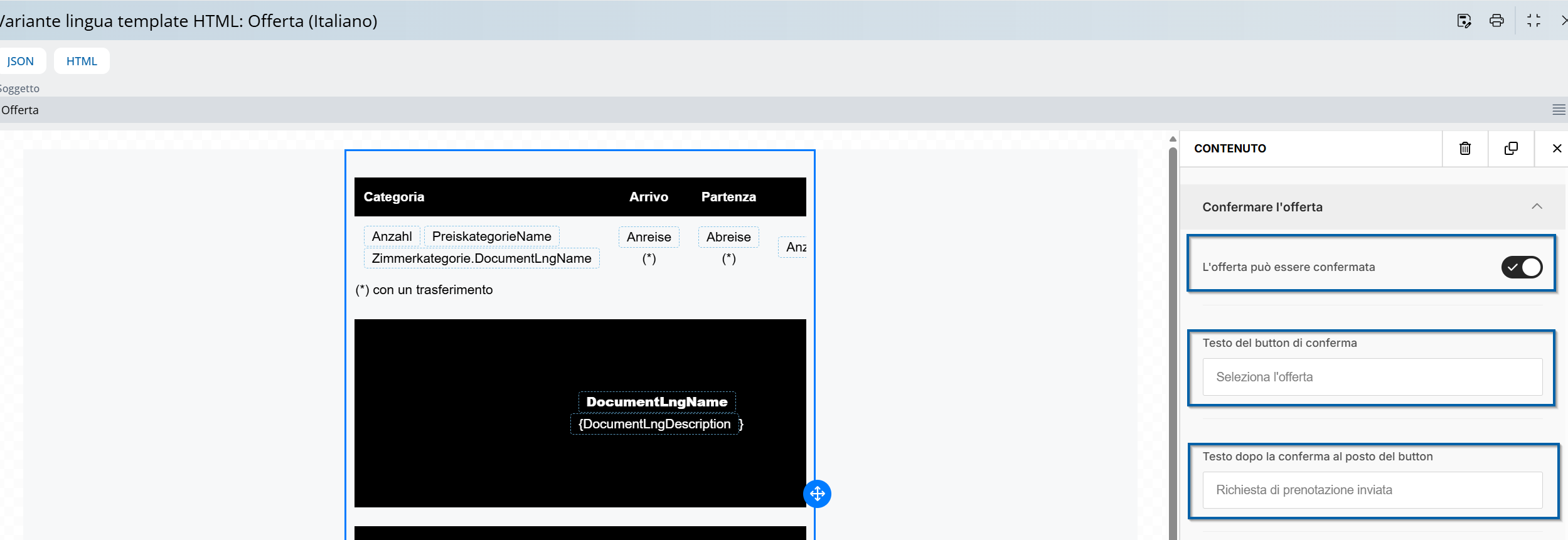 Se si crea un nuovo modello da zero e si trascina il blocco dell'offerta nel modello, il pulsante "Seleziona offerta" è già integrato nel blocco dell'offerta. Se non si desidera che questi pulsanti vengano inclusi in questo modello, è possibile disattivarli facendo clic sul blocco dell'offerta nelle impostazioni a destra. Inoltre, è necessario inserire il testo per il pulsante di conferma e il testo che deve essere mostrato al posto del pulsante dopo la conferma.