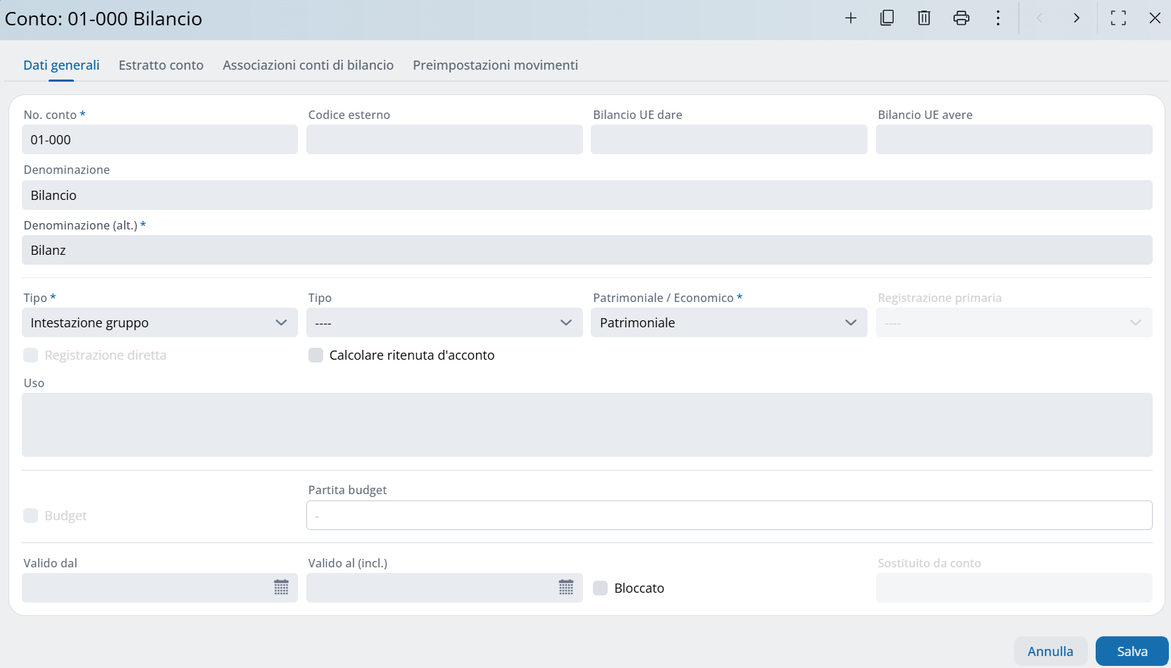 | Denominazione / Denominazione (alt.) | Assegna una denominazione al gruppo o al conto oppurela denominazione nell'altra lingua. |