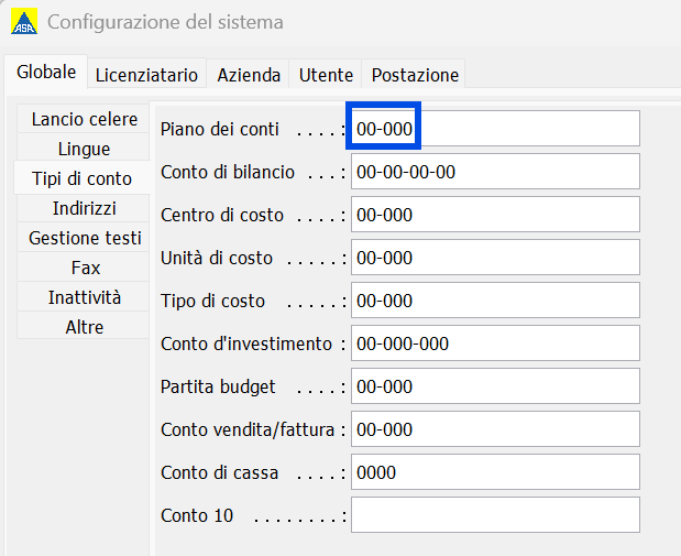 ASA HOTEL offre la possibilità di classificare i conti in gruppi con un'intestazione gruppo e una fine gruppo. Anche la numerazione dei conti deve essere adattata a questa struttura. Un'assegnazione di numeri di questo tipo potrebbe avere il seguente aspetto, ad esempio: xx-xxx. Come il numero di conto corrente. Può essere inserita qui: