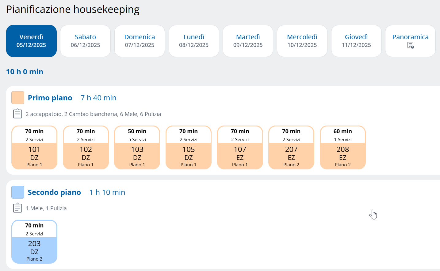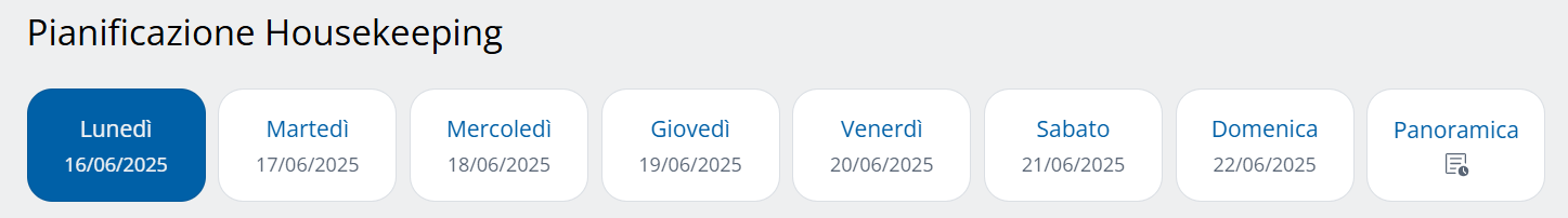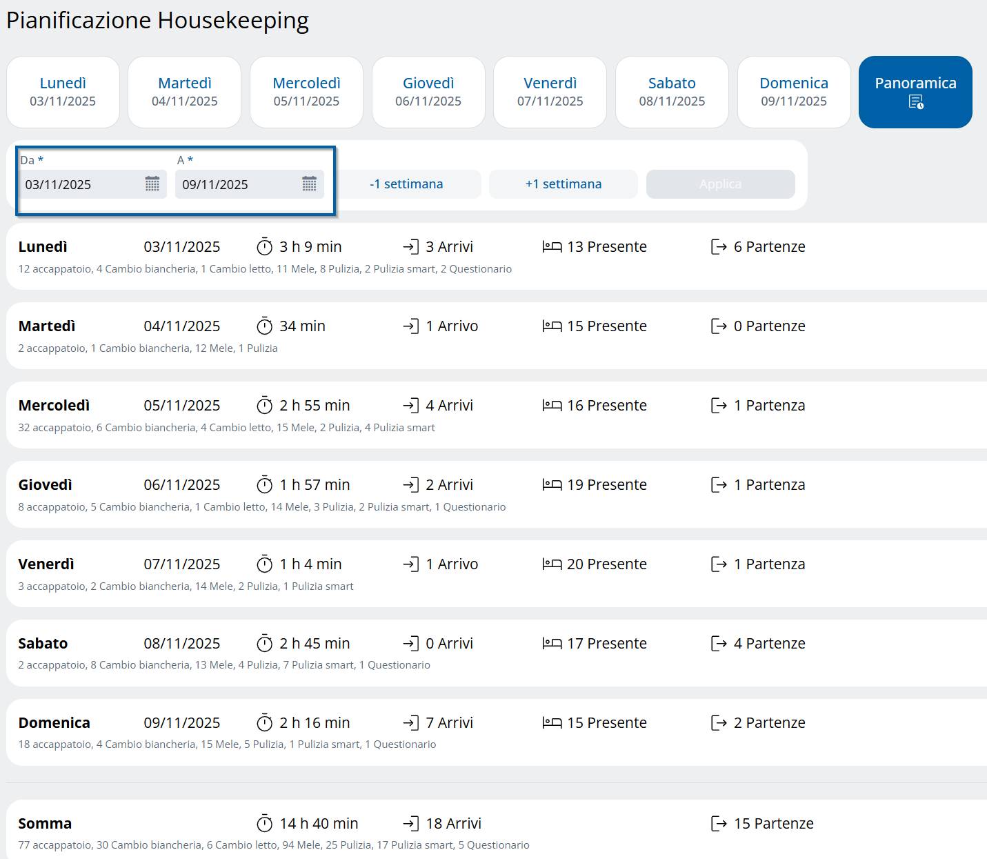 - Panoramica centrale: la panoramica fornisce una visione d'insieme dei compiti di housekeeping pianificati per i sette giorni successivi.