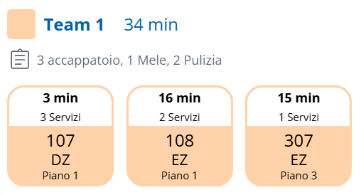 Nella vista giornaliera, vedrai diverse schede che rappresentano i rispettivi gruppi di collaboratori housekeeping. I gruppi di collaboratori possono essere memorizzati nella camera e nei collaboratori. Nel titolo vengono mostrate diverse informazioni: