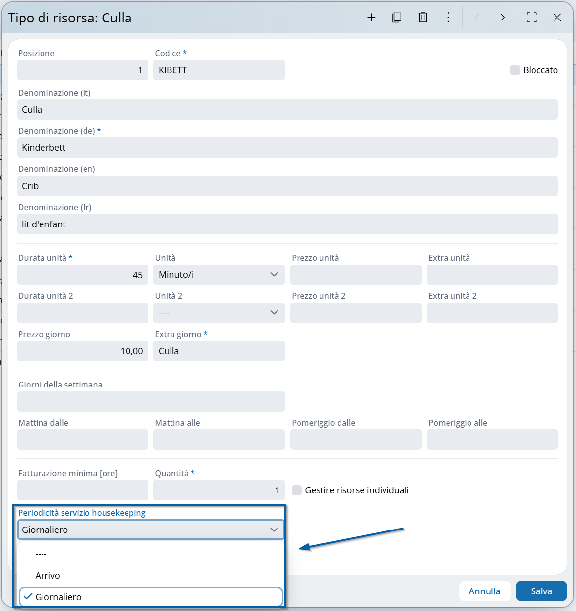 - Nel tipo di risorsa è stato aggiunto un nuovo elenco di selezione "Periodicità servizio housekeeping", che indica se e come il tipo di risorsa deve essere gestito come attività di housekeeping.