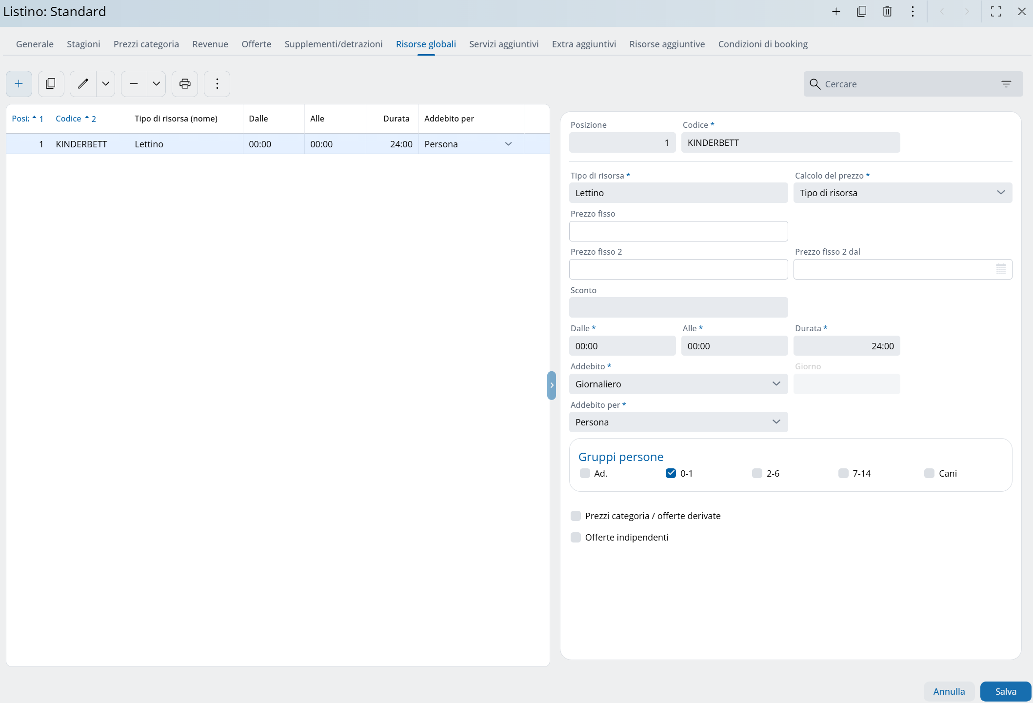 Le risorse globali funzionano in modo simile a supplementi e detrazioni globali. Aggiungono automaticamente i prezzi base e/o le offerte secondo regole definite. Una tipica risorsa globale è, ad esempio, un lettino o un seggiolone.
