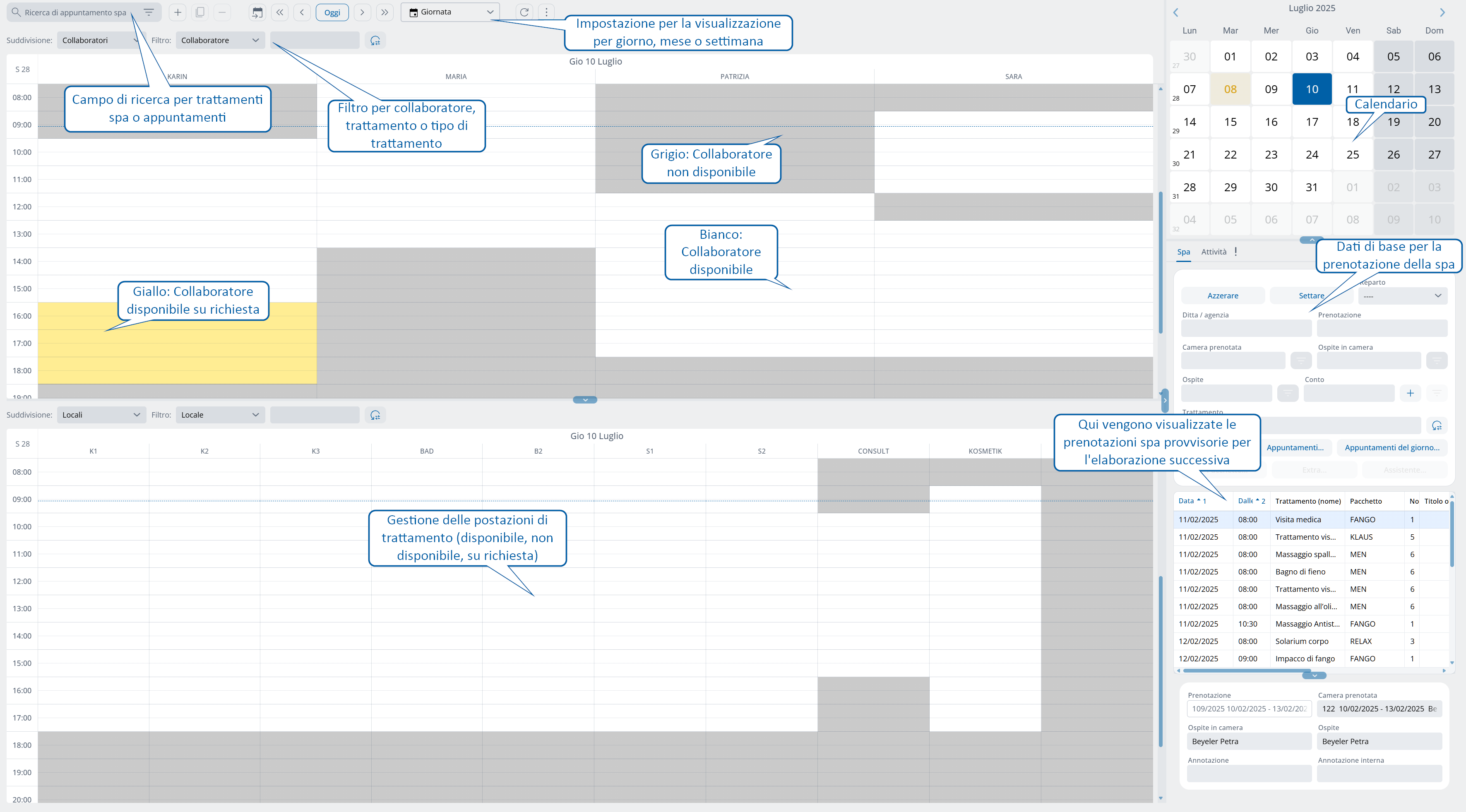 La tabella in basso a destra svolge un ruolo speciale. Qui sono elencati gli appuntamenti spa provvisori. Questi possono provenire dall'Assistente Spa, ad esempio, che può essere utilizzato anche dal personale della reception per prenotare (provvisoriamente) interi pacchetti premendo un pulsante. Il personale della spa è quindi responsabile dell'elaborazione delle prenotazioni provvisorie e della loro conversione in prenotazioni regolari (con collaboratore e locale).