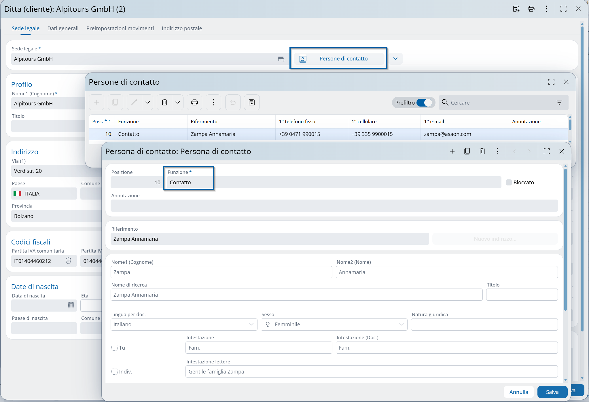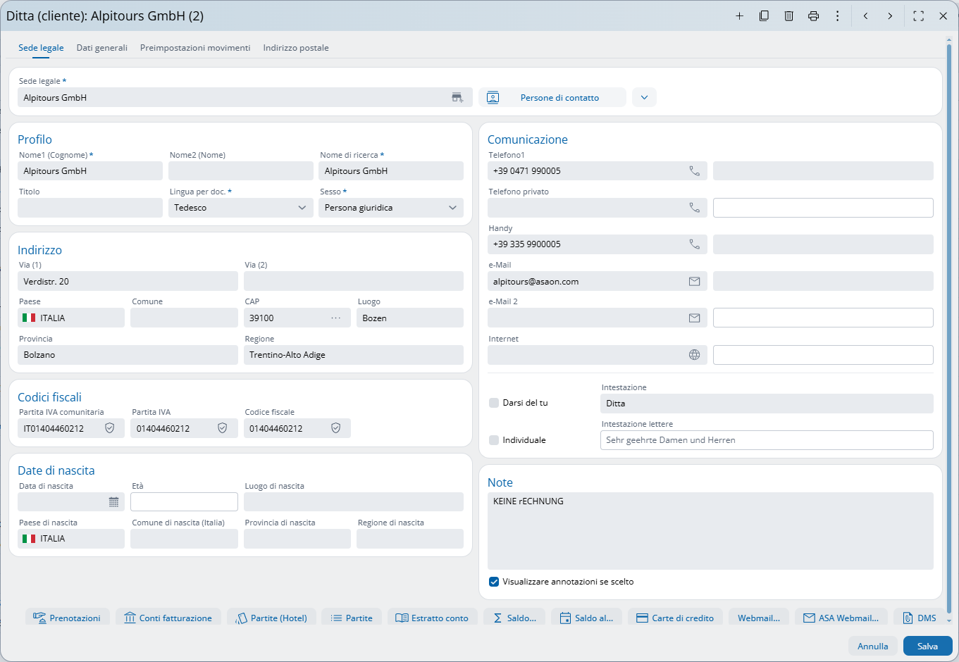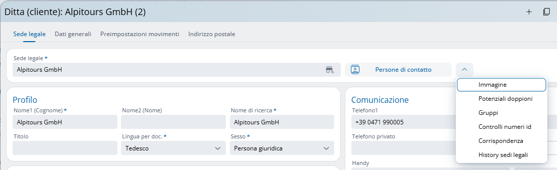 Nella prima scheda "Sede legale" dell’archivio aziende vengono registrati i dati aziendali fondamentali (l'indirizzo) e la persona di riferimento (persona di contatto primaria per prenotazioni e comunicazioni):