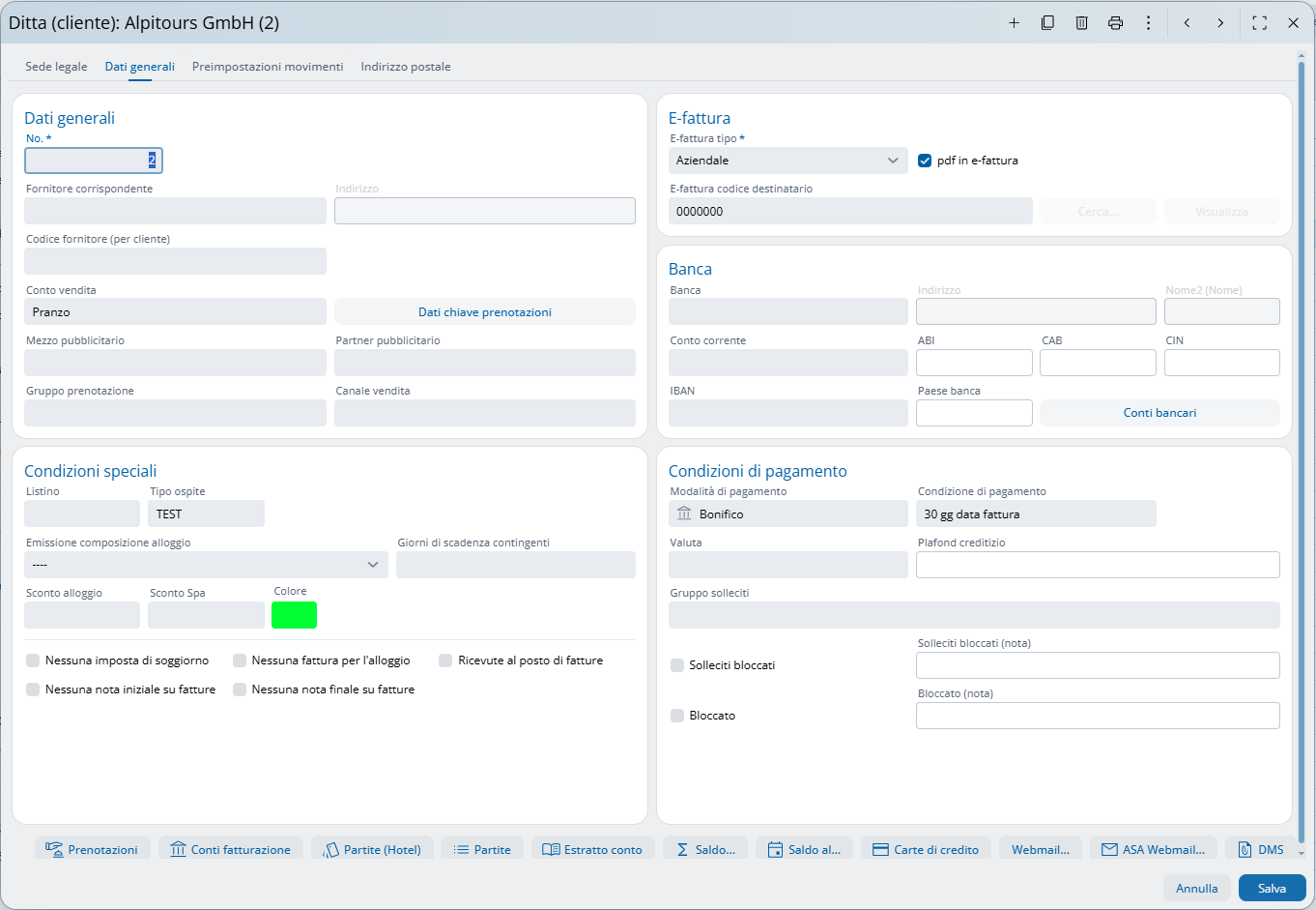 Nella scheda “Generale” è possibile salvare diverse informazioni aggiuntive sull’azienda, utili per analisi, marketing e processi automatici. Qui si possono inserire, ad esempio, il canale di prenotazione o un mezzo pubblicitario predefinito. È inoltre possibile registrare un listino prezzi personalizzato che verrà applicato automaticamente ad ogni prenotazione, oppure definire uno sconto fisso riservato all’azienda. Anche i dati bancari e le condizioni di pagamento possono essere inseriti. La scheda “Generale” supporta così una gestione individuale e automatizzata dei clienti aziendali.