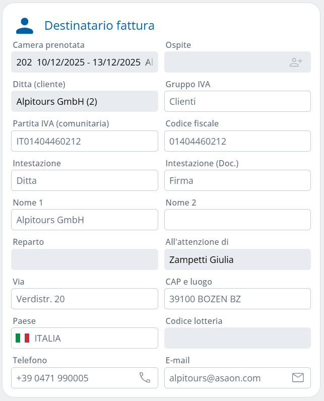 Il nome della prima persona di contatto che corrisponde alla funzione definita nel campo tipo di relazione per la fatturazione viene importato automaticamente nell’elemento “All’attenzione di”.