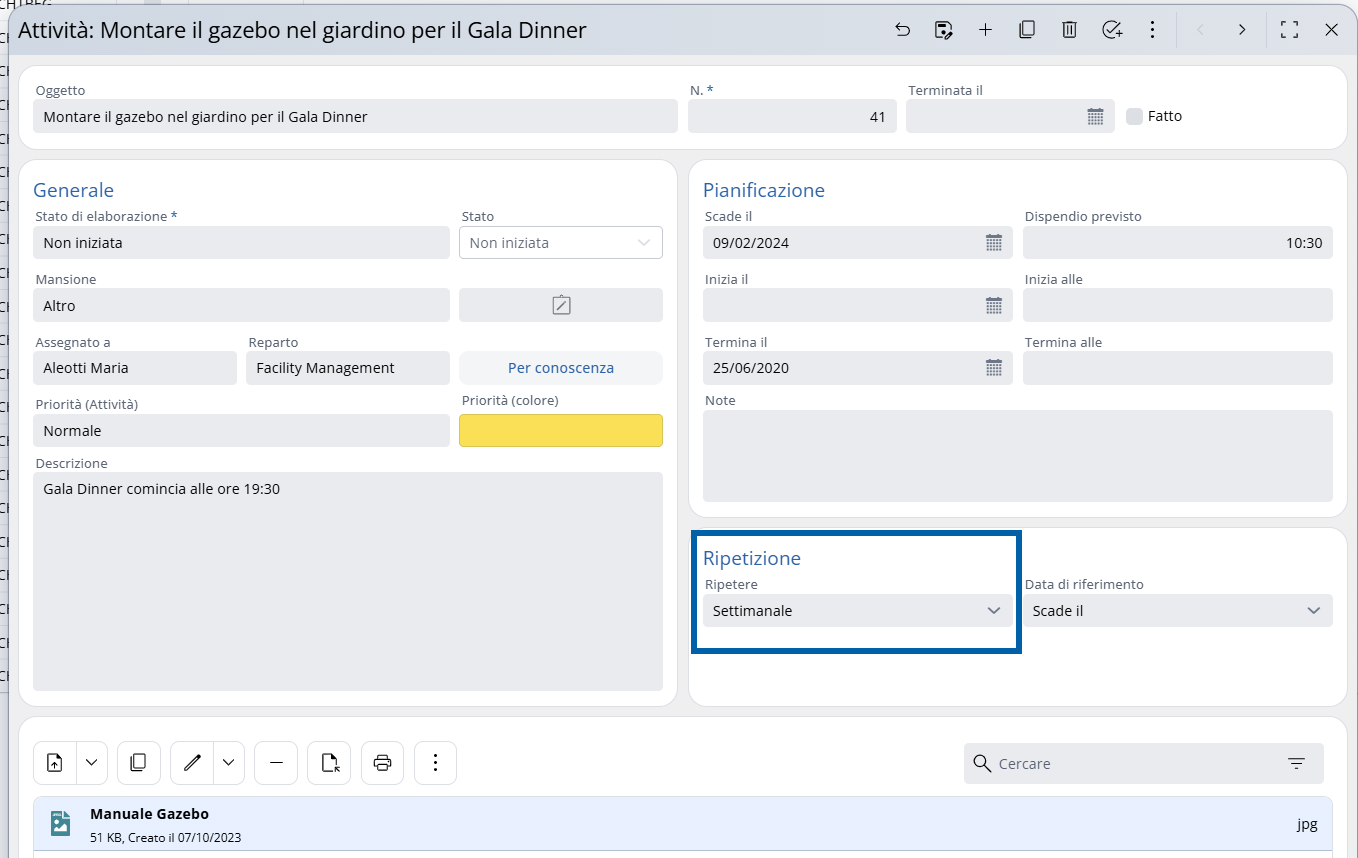 - Ora è possibile specificare una ripetizione nell' attività. (Giornaliero, Settimanale, Giorni settimanali, Mensile, Annuale, Ogni X giorni, Ogni X settimane, Ogni X mesi, Ogni X anni). Se viene memorizzata una ripetizione per un'attività e questa viene completata, viene creata automaticamente una nuova attività. I campi della data vengono spostati a causa della ripetizione. Quando si elimina l'ultima attività di una serie, viene visualizzata una finestra di dialogo in cui è possibile eliminare l'intera serie o solo questa attività (le attività successive continueranno a essere create). Nell'attività, è possibile specificare se la data di riferimento per l'attività successiva debba essere la data di "Scade il" o la data di "Eseguita il".