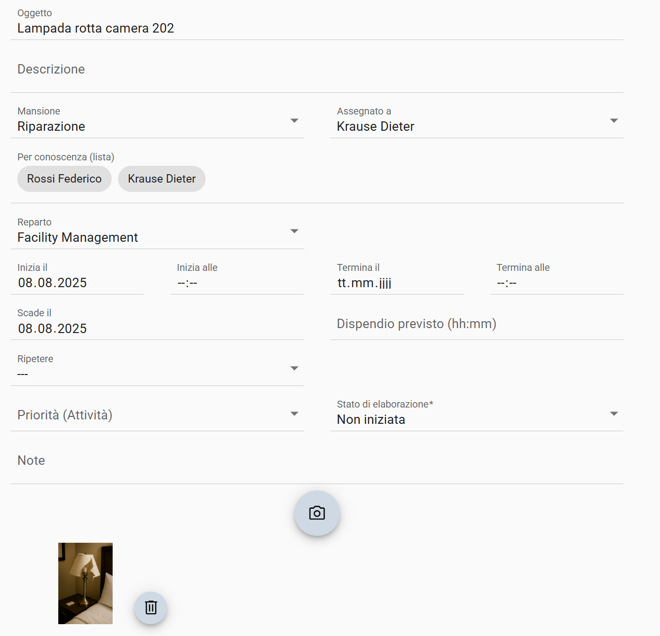 - Ora è possibile scattare una foto all'interno dell'attività nei servizi della web app. La foto viene memorizzata nella raccolta DMS dell'attività e visualizzata nel modulo.