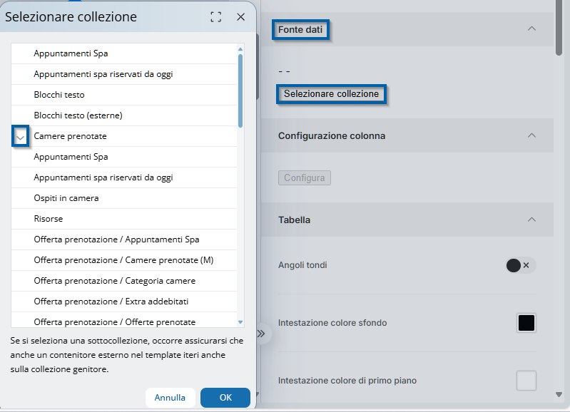 Nel pannello delle impostazioni a destra, sotto “Fonte dati”, selezionare una raccolta: