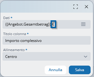 Il campo ‘Dati’ può essere arricchito, oltre che con la formula, anche con altri caratteri; ad esempio, nei campi che contengono un prezzo, è possibile aggiungere il simbolo ‘€’ dopo la formula.