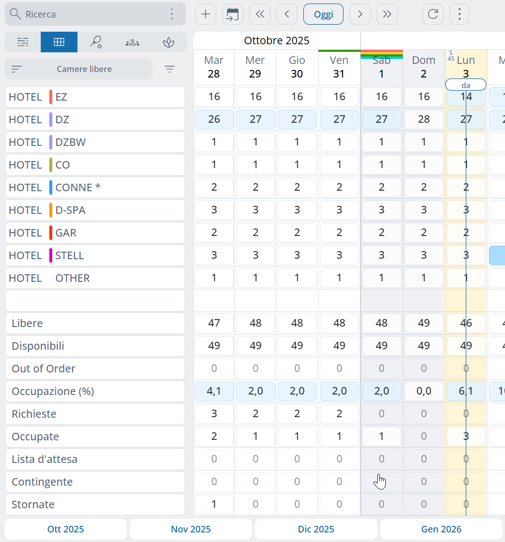 Le prenotazioni possono anche essere spostate completamente: se la camera assegnata alla prenotazione non è disponibile nel nuovo periodo, la prenotazione verrà spostata in un’altra camera libera della stessa categoria.