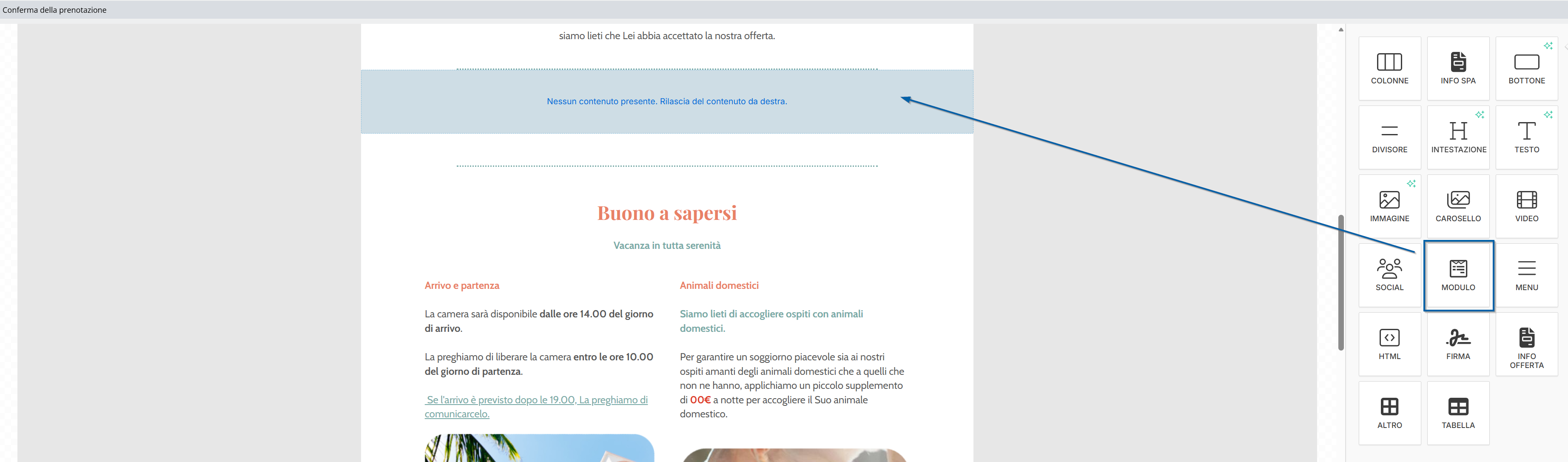 Lo strumento “Modulo” è stato attivato per la landing page. Questo strumento consente agli ospiti, dopo aver ricevuto l’e-mail, di inserire sulla landing page testi liberi e annotazioni con informazioni importanti relative alla loro prenotazione, oppure di effettuare una selezione.
