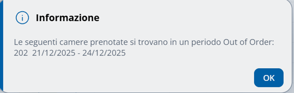 - Se si inserisce una prenotazione che rientra in un periodo Out of Order, il sistema mostra un avviso prima di completare la prenotazione.