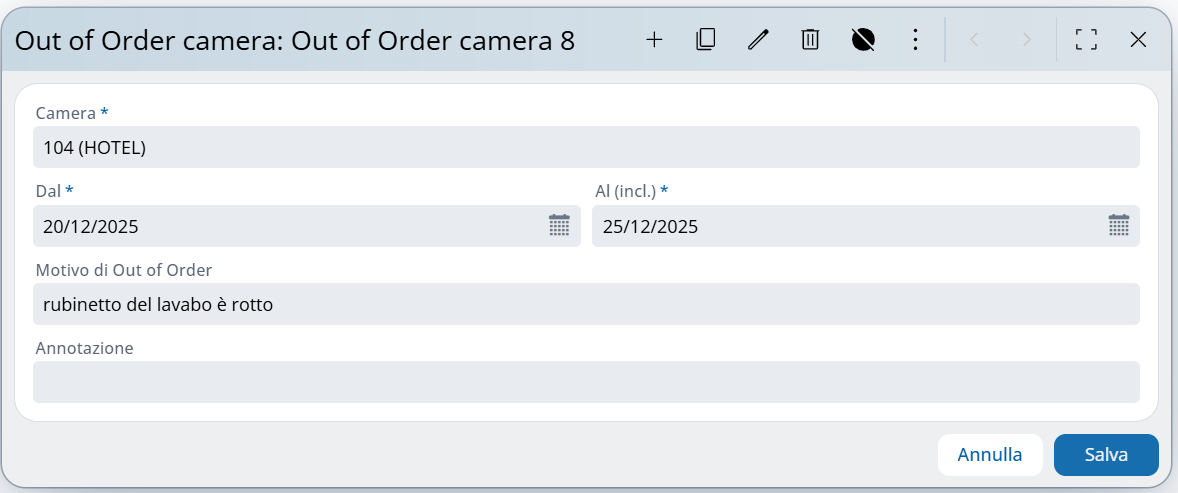 Il periodo di una registrazione Out of Order deve essere univoco. Non sono consentite sovrapposizioni, nemmeno nel caso in cui venga indicato un motivo o un altro tipo di nota.
