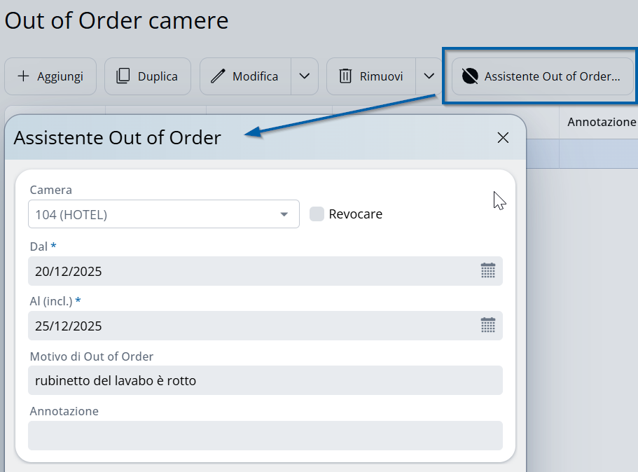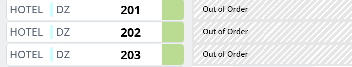 La funzione "Out of Order" facilita la gestione di camere o sale meeting temporaneamente non disponibili. Con questa funzione è possibile bloccare aree per determinati periodi e documentarne i relativi motivi. Questi dati incidono sulla disponibilità, sia all’interno del sistema sia durante la trasmissione ai portali Internet.