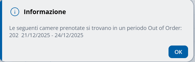 Se si inserisce una prenotazione che rientra in un periodo Out of Order, il sistema mostra un avviso prima di completare la prenotazione.