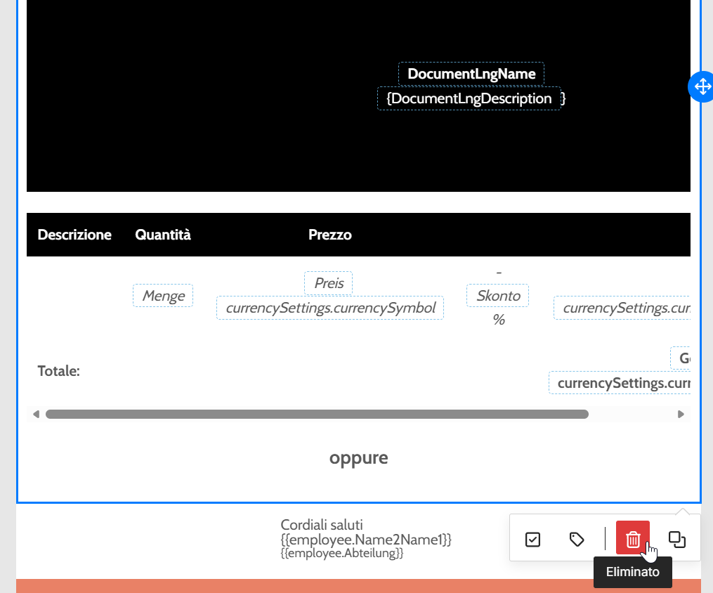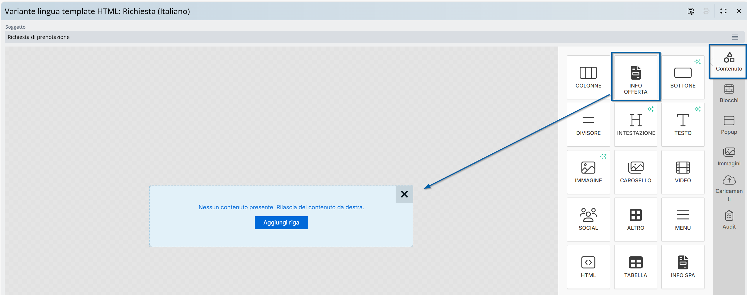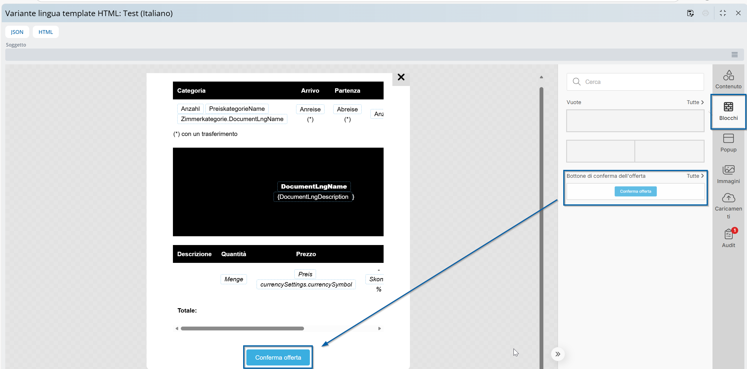 Se i modelli sono già stati creati prima della creazione del pop-up, il blocco dell'offerta deve essere cancellato in ogni modello (e in ogni lingua), e aggiunto nuovamente. Quindi va formattato nuovamente il nuovo blocco di citazioni.